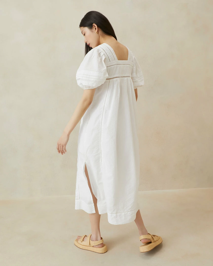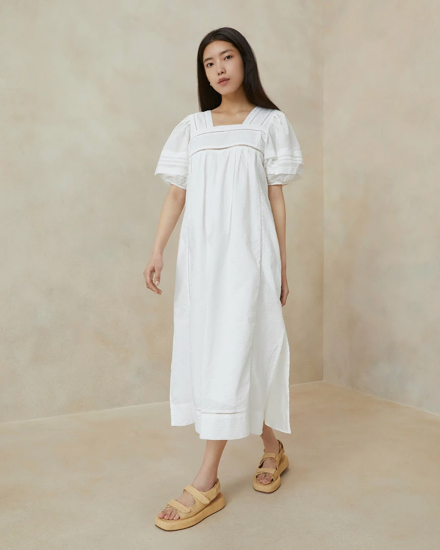 Long dress in white cotton. Features short, puffed sleeves, a square neckline, and ladder stitch embroidery.