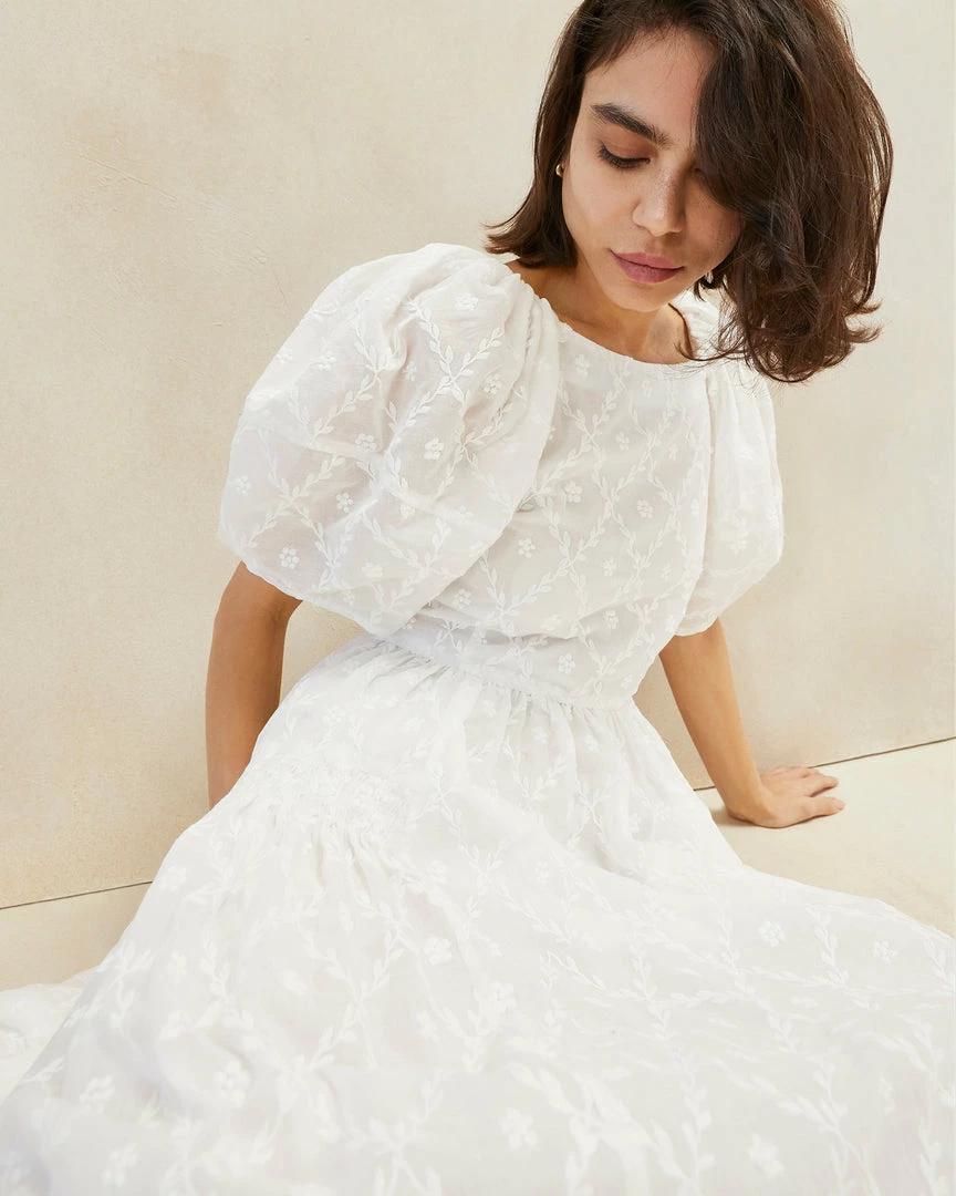 Smocked tiered dress in cream vine floral cotton voile. Features a square neck and elasticated straps. One of Jessie’s favorite materials for its light weight and ability to take color, our cotton voile is sourced in Italy.