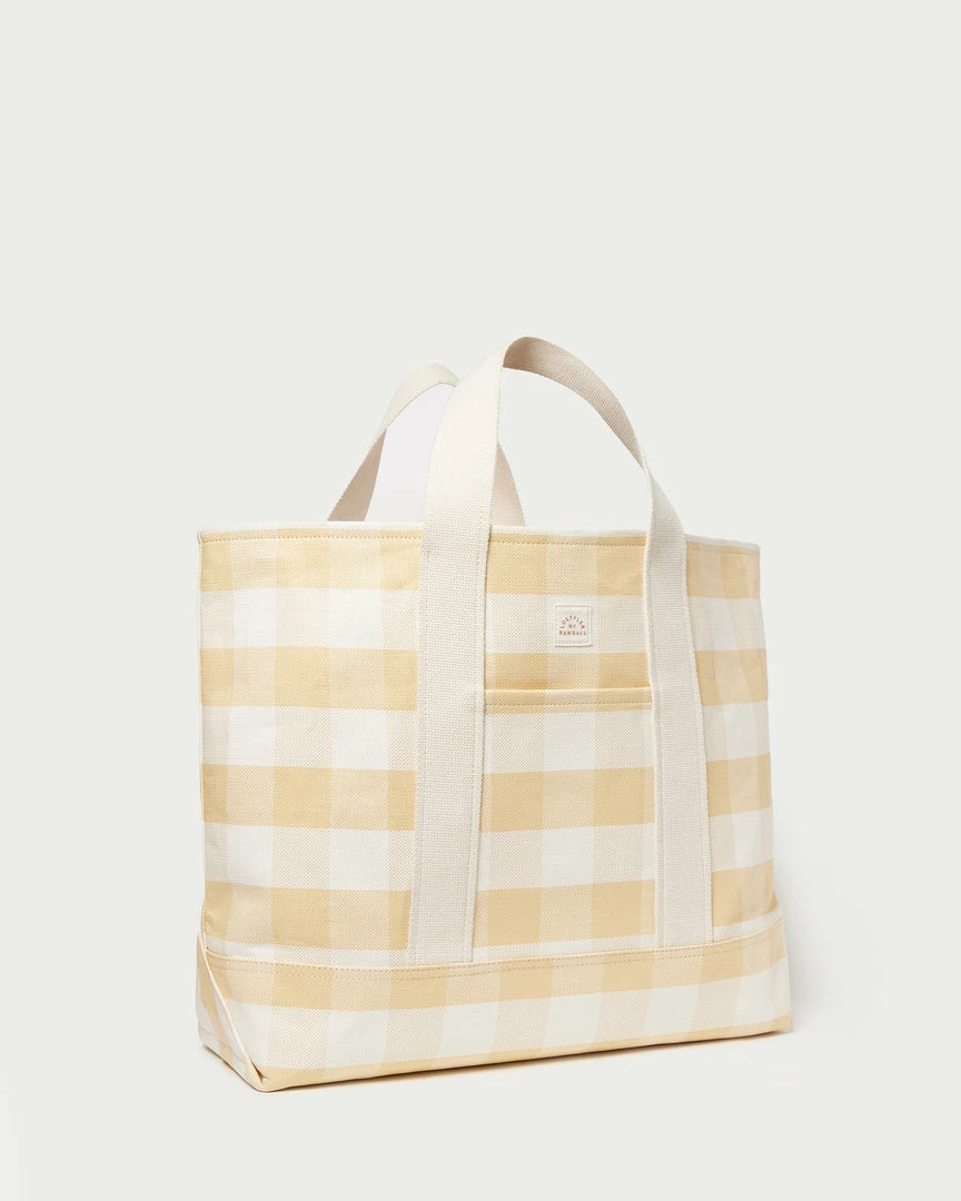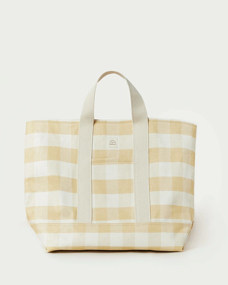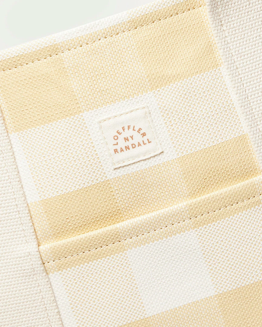 Oversized open tote bag in hay pale yellow and cream-colored gingham woven plastic. Features natural-colored cotton woven handles and an inside pocket.