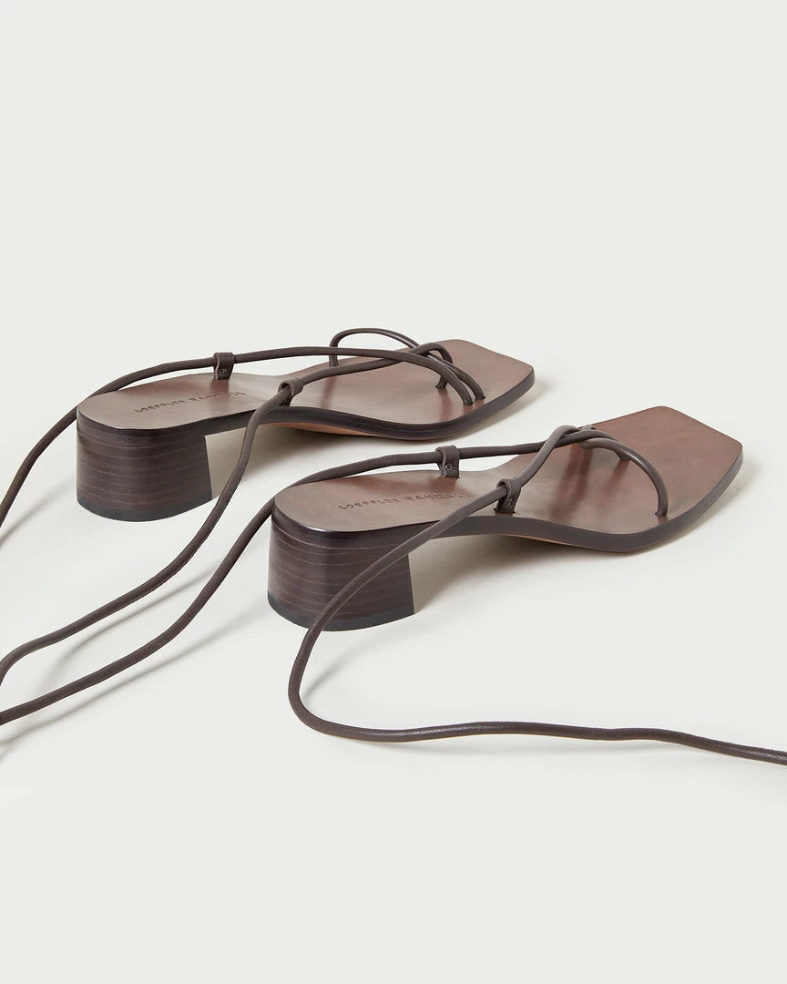 Strappy wrap sandal on a low heel in chocolate brown nappa leather. Features a plank footbed, an open, squared toe, and wrap tie closure. 1.5 inch heel.