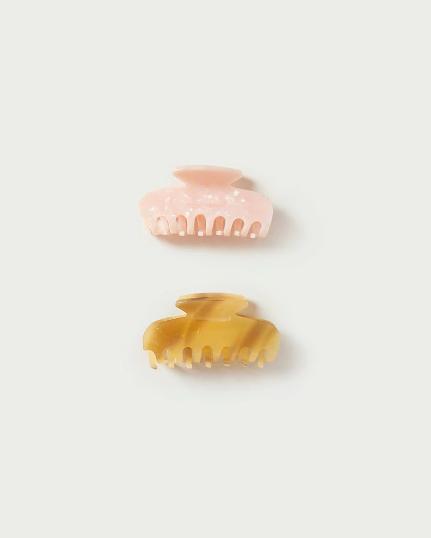 Set of two resin claw hair clips, one tan and one pink.