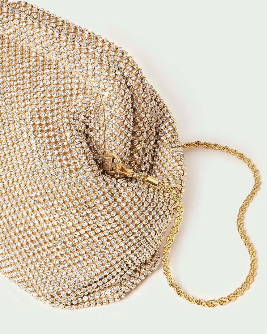 Frame pouch in gold diamanté. mesh. Features a removable twisted gold metal chain strap, frame closure, full lining, and an interior slip pocket.