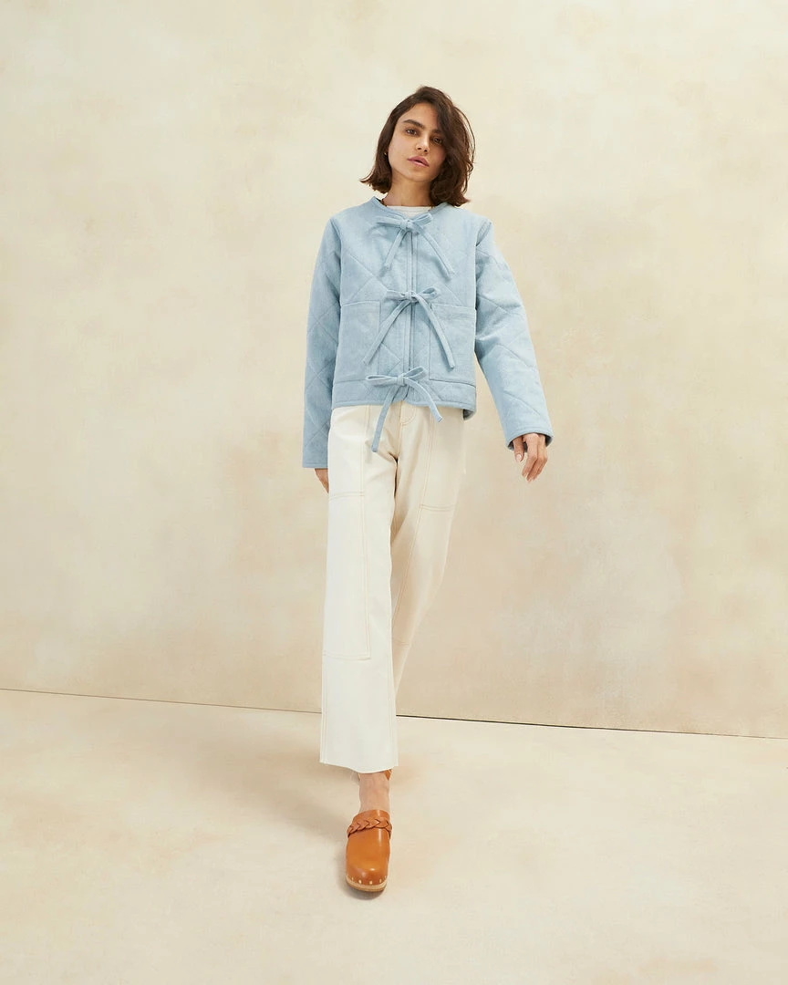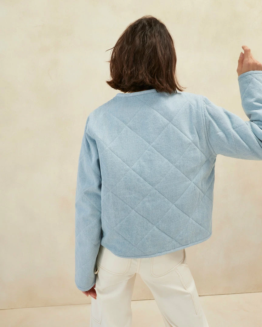 Quilted jacket in light denim with piping along the neckline and down the center. Features two pockets, a boxy fit, and functional tie closures.