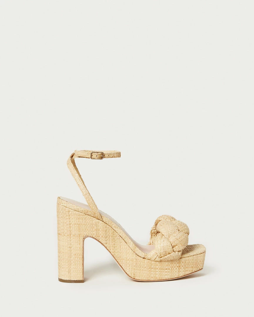 Platform sandal in natural raffia with puffy braided detail. Features a padded footbed with gold stamped logo. Open toe with adjustable buckle ankle strap. 4.5 inch heel, 1 inch platform.