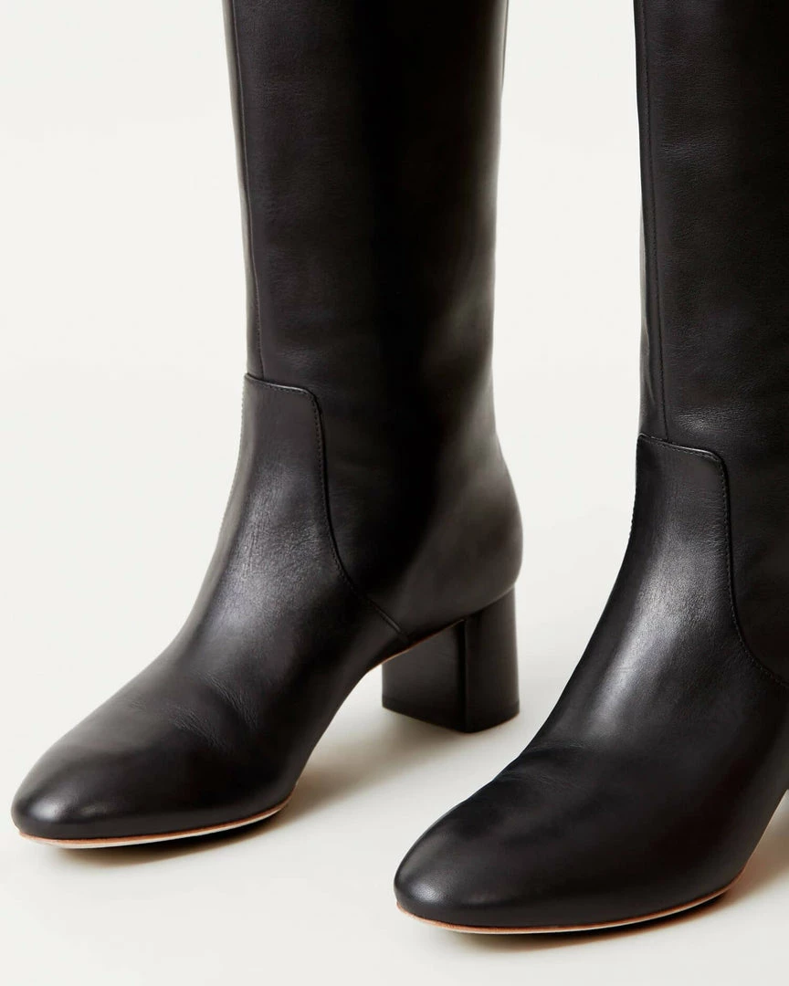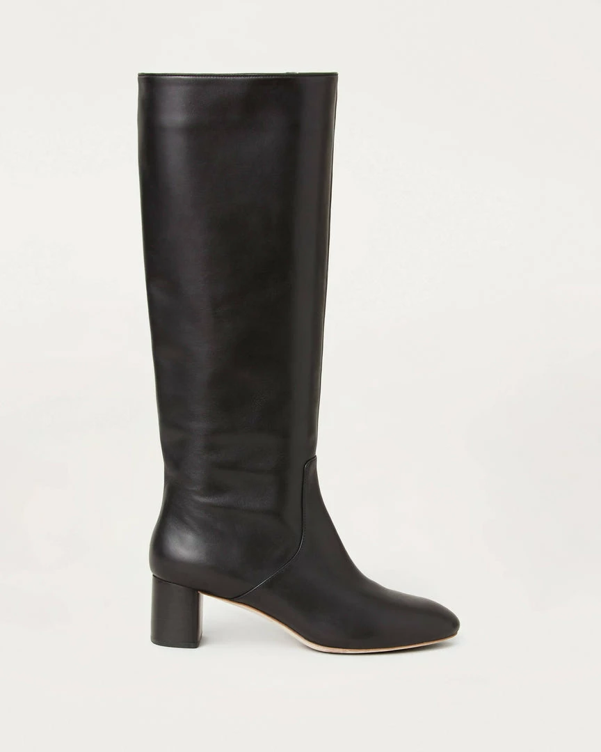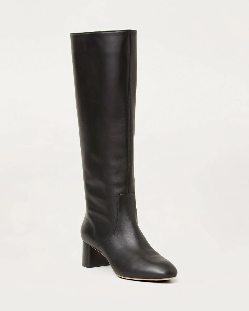 Tall shaft boot with mid-heel in black soft calf leather. Padded footbed with gold stamped logo. Almond toe, pulls on. 2 inch heel.