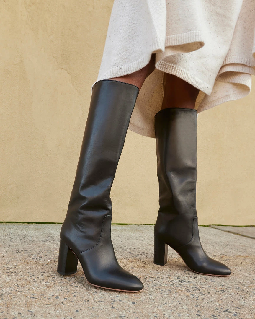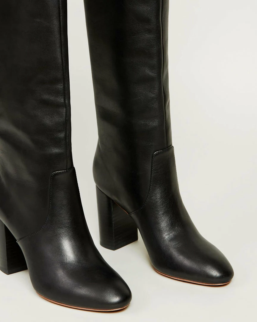 Tall shaft boot with high heel in black soft calf leather. Padded footbed with gold stamped logo. Almond toe, pulls on. 3.5 inch heel.