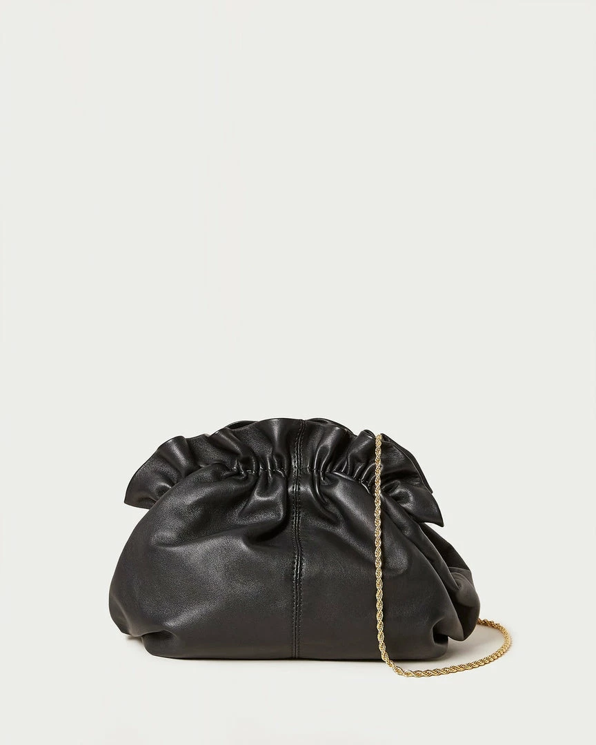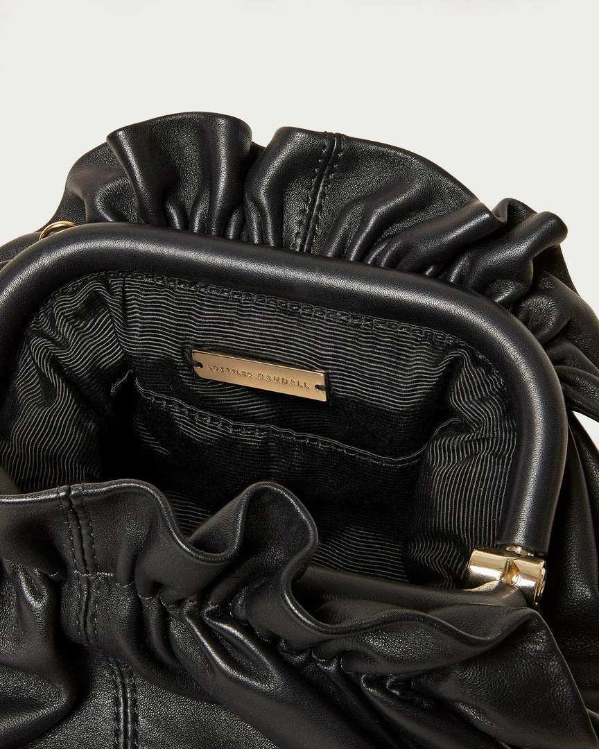 Gathered mini frame clutch in black nappa leather with detachable gold metal twisted chain crossbody strap.