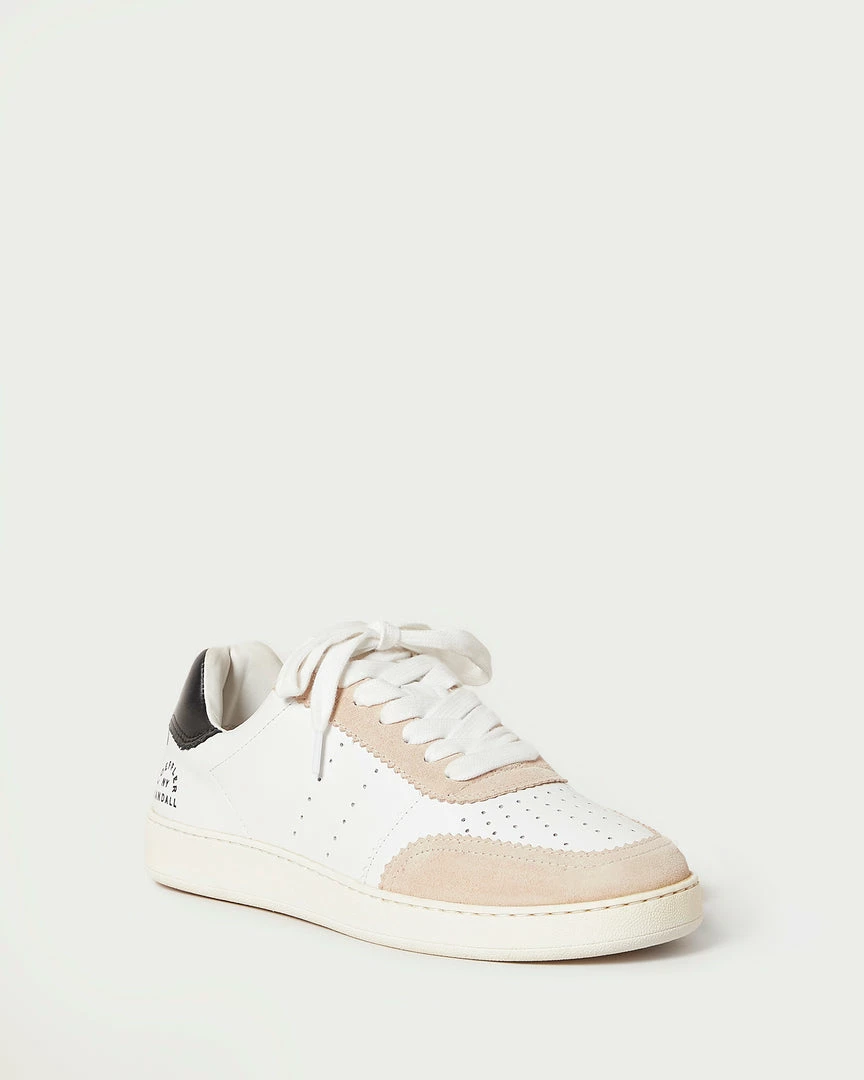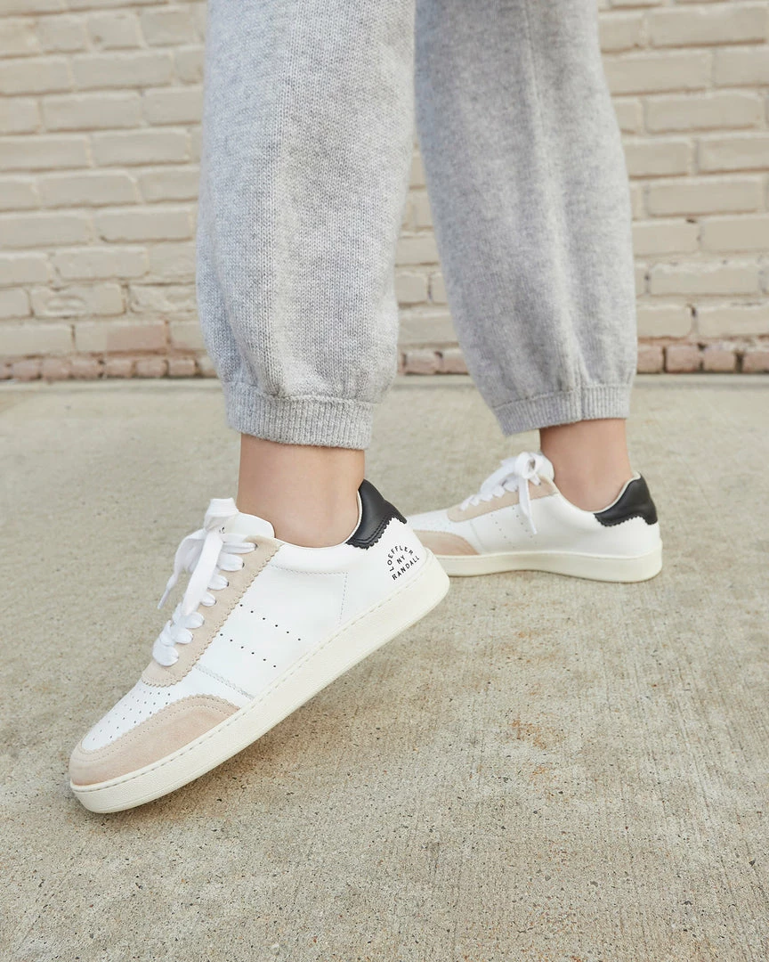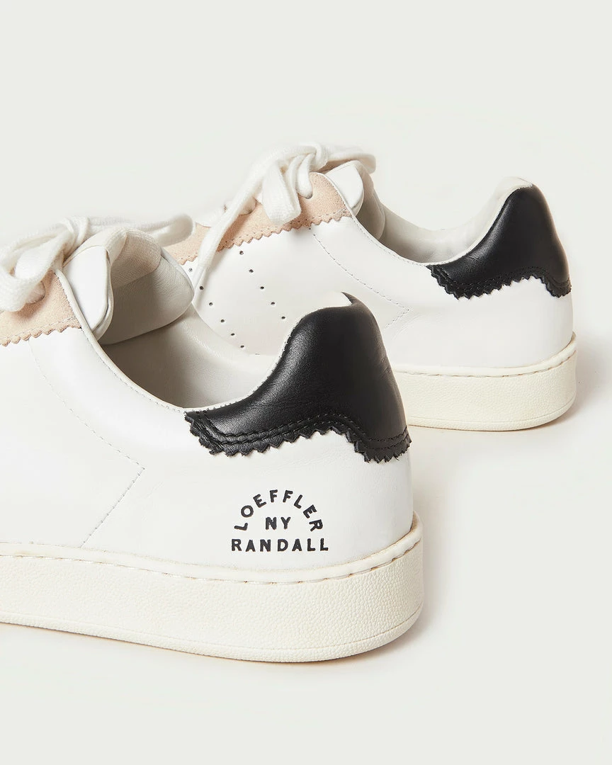 Low top sneaker in white nappa leather with a black leather heel tab and ecru/beige suede trim. Features a padded footbed with LR sport logo and a recycled rubber outsole. Round toe with white laces.