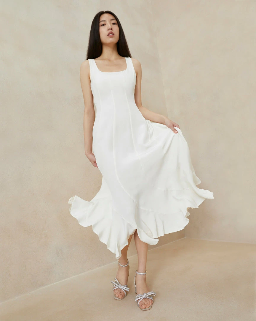 Mid-length sleeveless dress in cream silk crepe featuring curved seams for a beautiful drape effect.