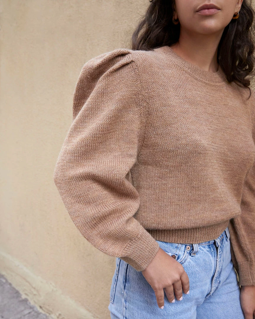 Puff-sleeved short pullover crew neck sweater in camel colored wool. A lightweight knit that can be worn year-round. This sweater is 100% Andean Highland wool made in Peru by a collective of knitters whose work provides support to women and children living in poverty on an island called Amantani on Lake Titicaca.
