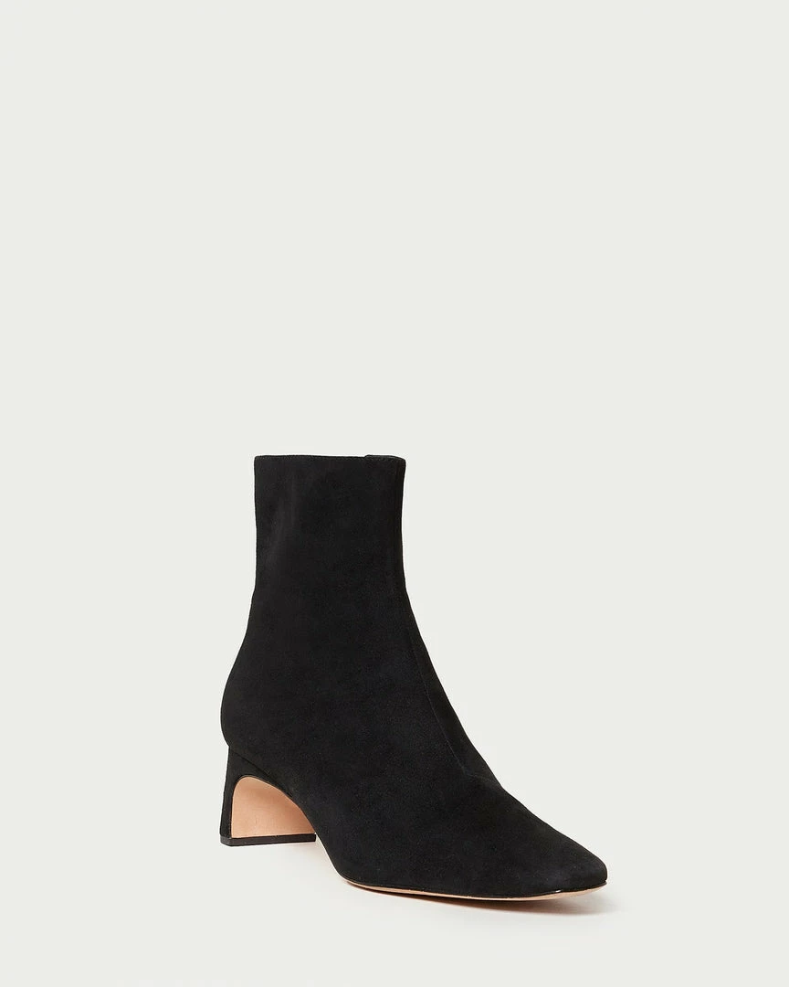 Bootie in black suede. Square toe, pulls on with concealed side zipper. 2 inch wrapped heel.