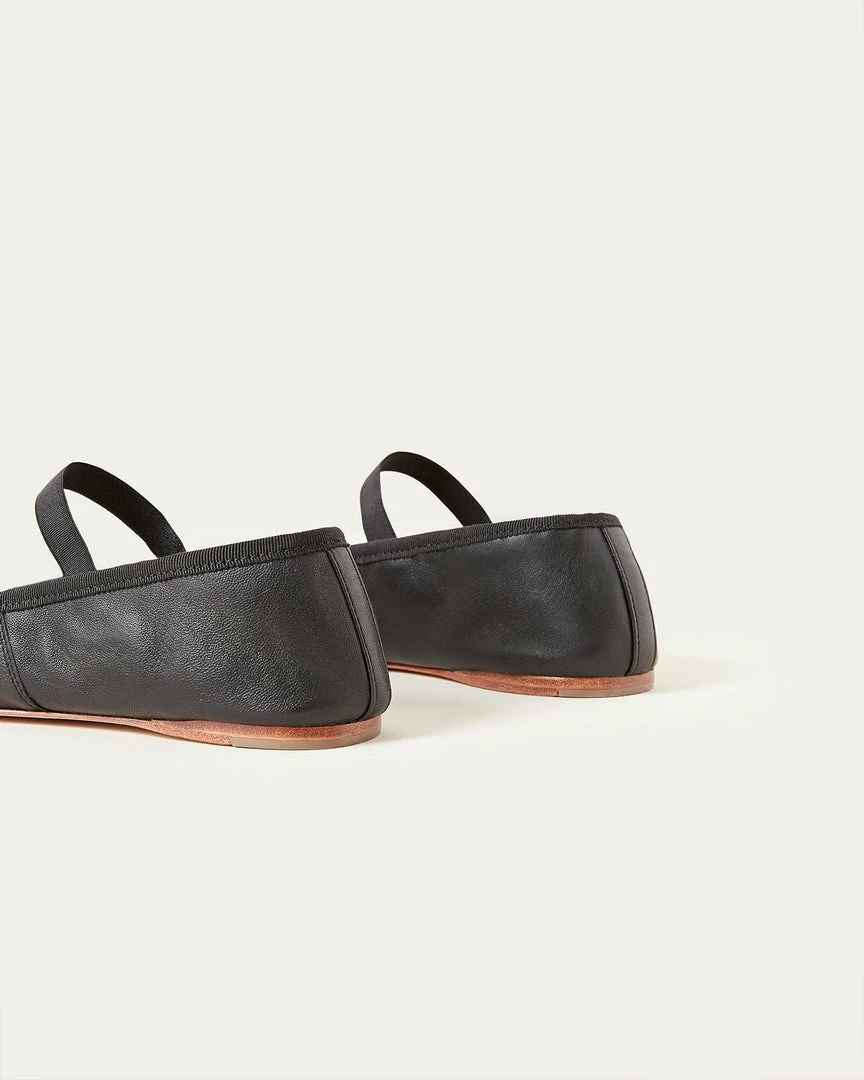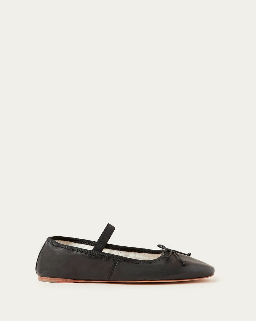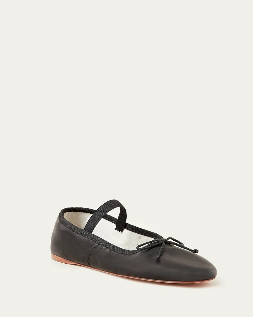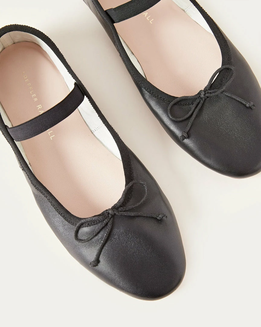 Soft ballet flat in black glove calf leather with elastic bridge strap and bow detail at toe. Padded footbed with stamped logo and leather sole.