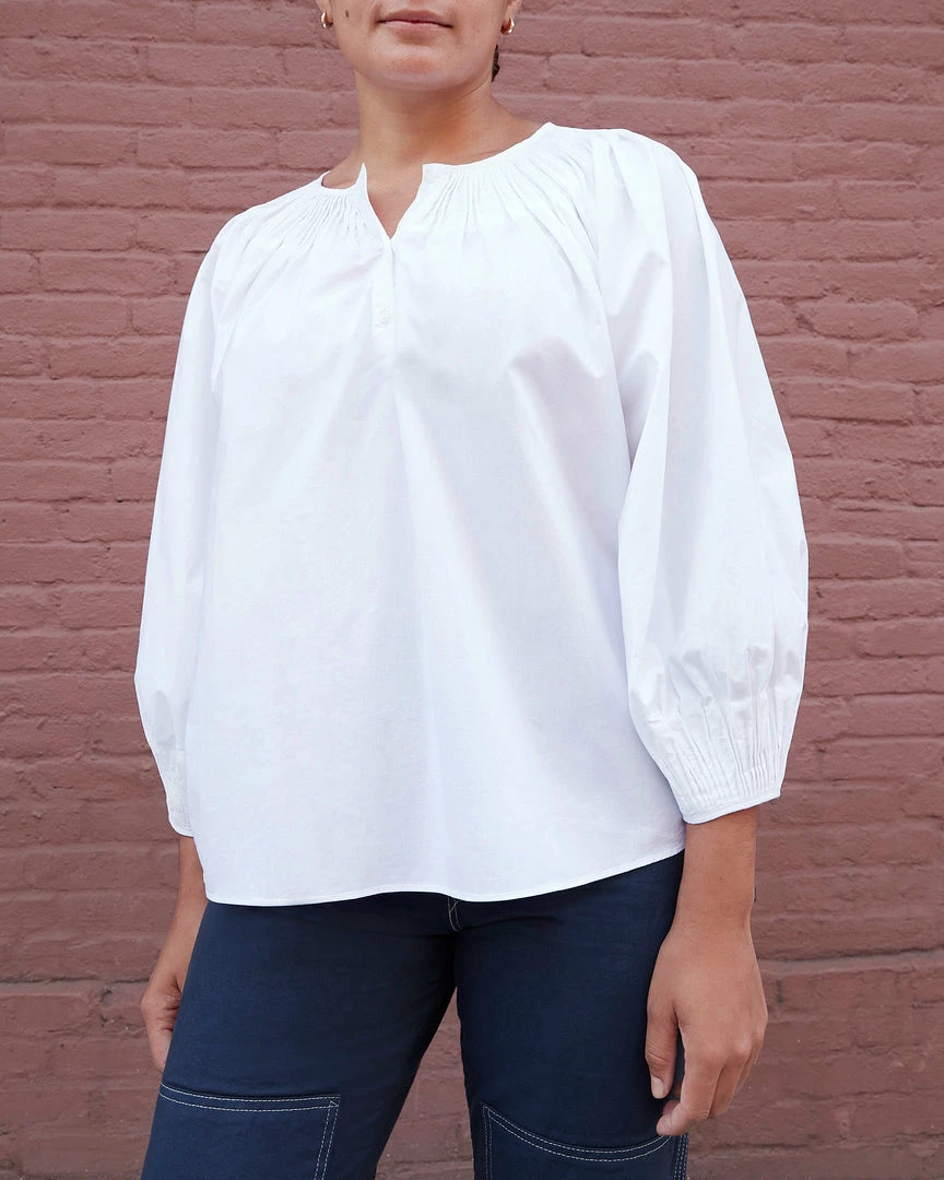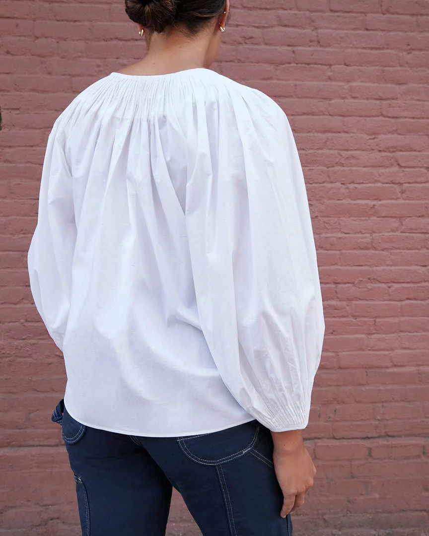 Bell sleeve blouse in white with shirred collar, smocking detail, and mother of pearl button closures.