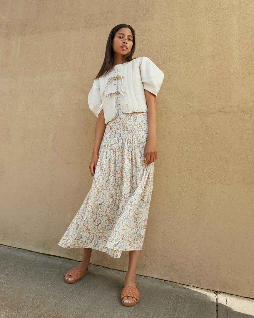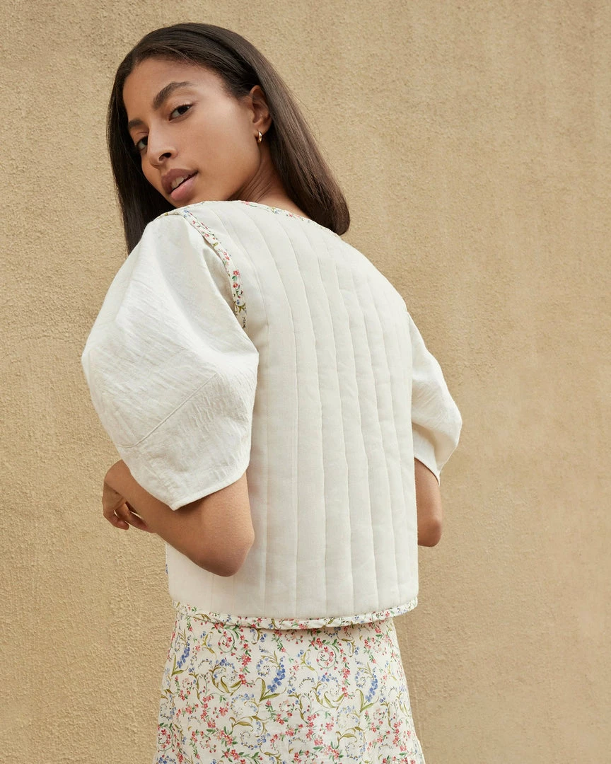 Quilted vest in natural white quilted cotton with a romance floral trimming and details with double-tie front closure.