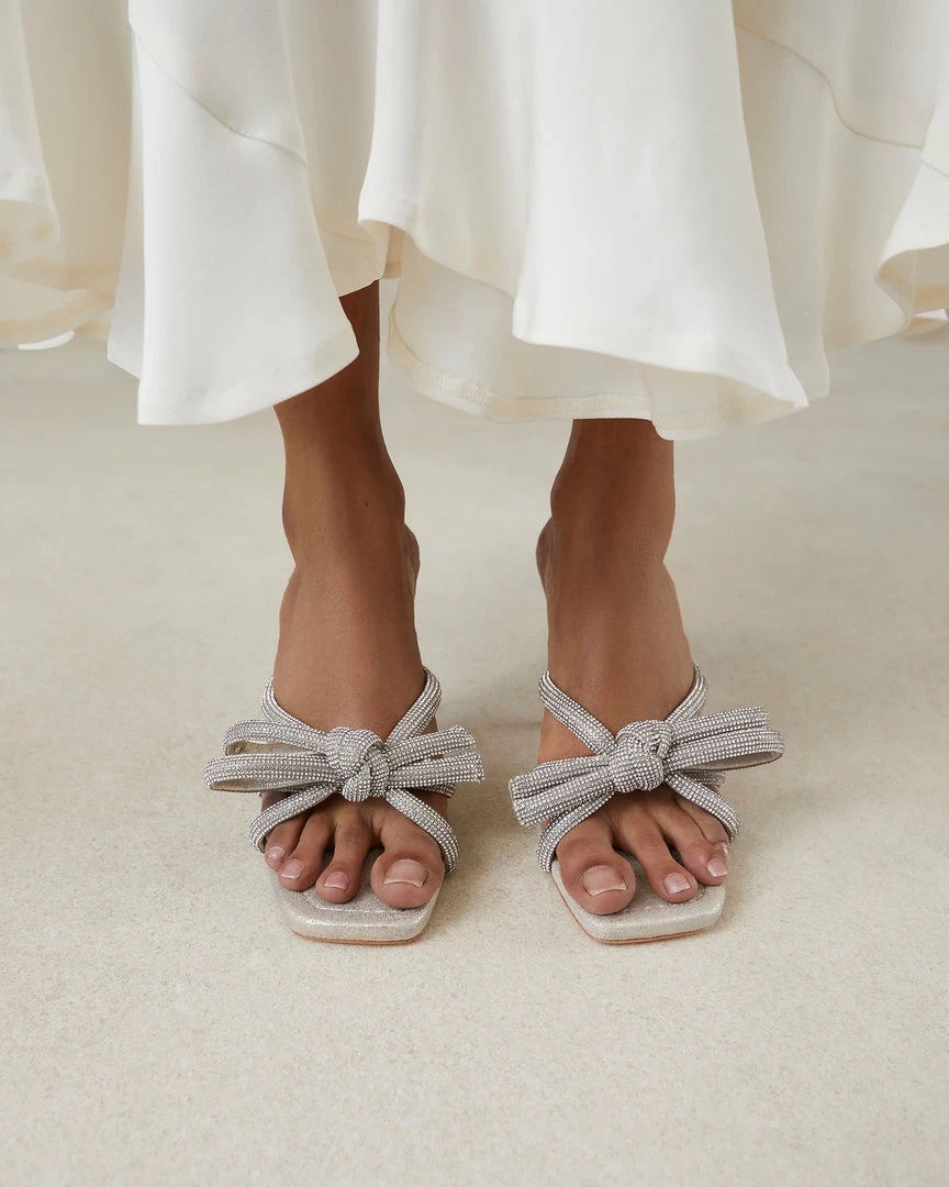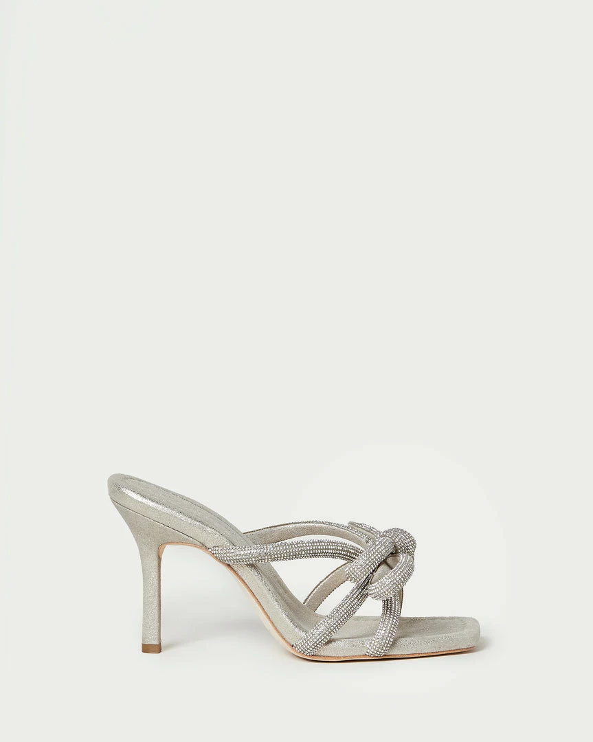 Heeled sandal with knotted bow detail in light beige sparkle suede with rhinestone embeliishment. Features a padded footbed with gold stamped logo and an open, squared toe. 3.5 inch heel.
