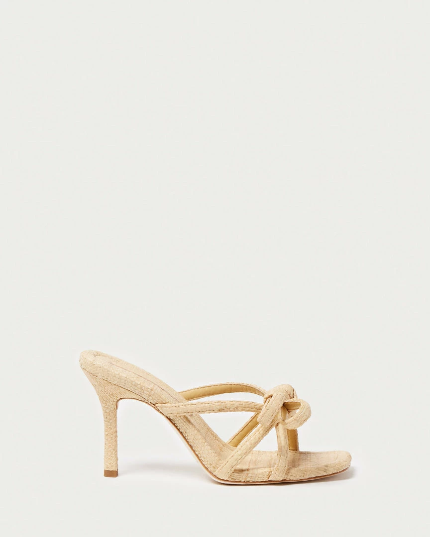 Heeled sandal with knotted bow detail in natural raffia. Features a padded footbed with gold stamped logo and an open, squared toe. 3.5 inch heel.