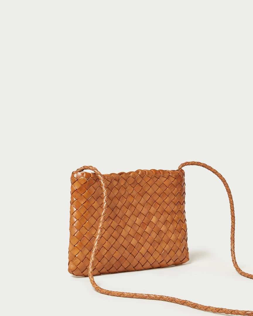 Small crossbody in timber brown woven vachetta leather. Features a zipper closure and cotton lining.