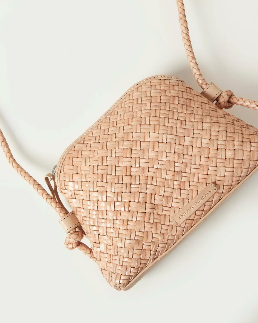 Mini crossbody bag in natural light beige woven leather. Features a zipper closure, cotton lining, an interior pocket, and a stamped logo.