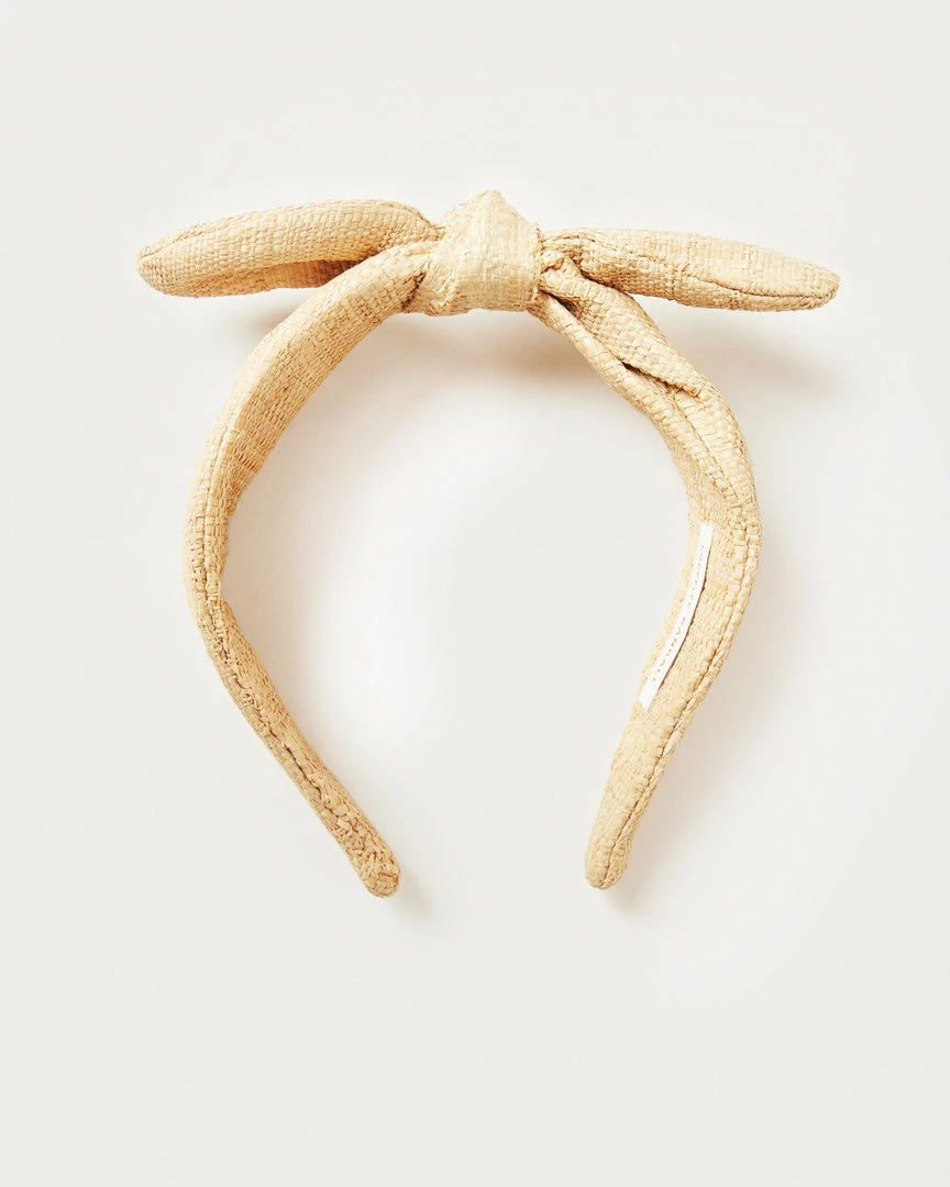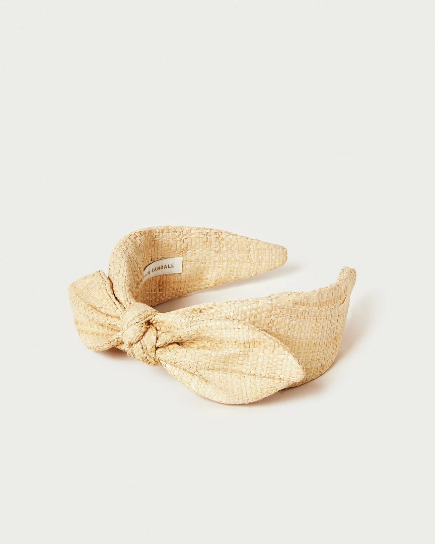 Wide knotted bow headband in natural raffia.