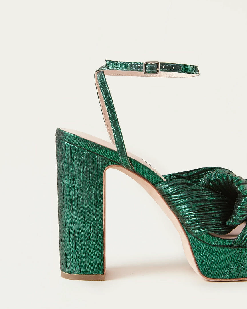 Pleated knot heeled platform sandal in a emerald green metallic lamé. Padded raised footbed with gold stamped logo. Open toe with adjustable buckle ankle strap. 4.5 inch heel, 1 inch platform.