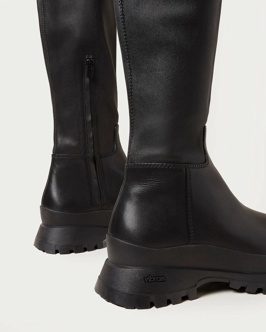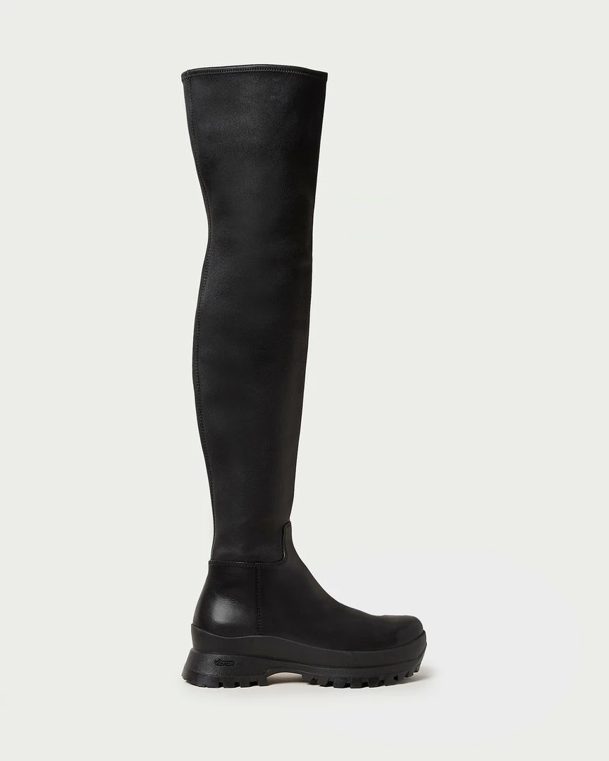 Over-the-knee lug sole boot in black stretch leather. Features a padded footbed with gold stamped logo, round toe, and a Vibram® outsole, which is engineered for quality and comfort with traction optimized for unstable terrain. Pulls on. 3 inch heel.
