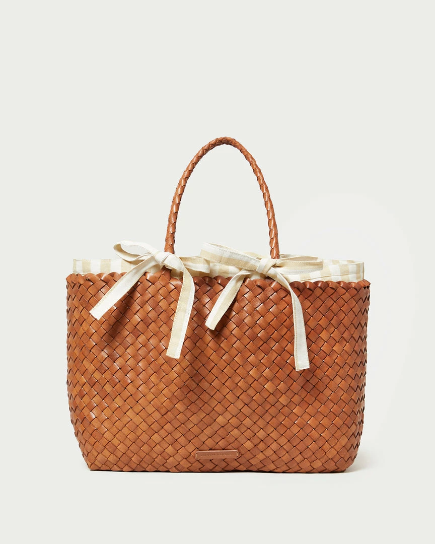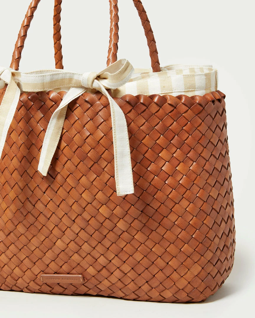 Large woven tote in timber brown vachetta leather with brown and cream gingham print linen lining and bow embellishment.