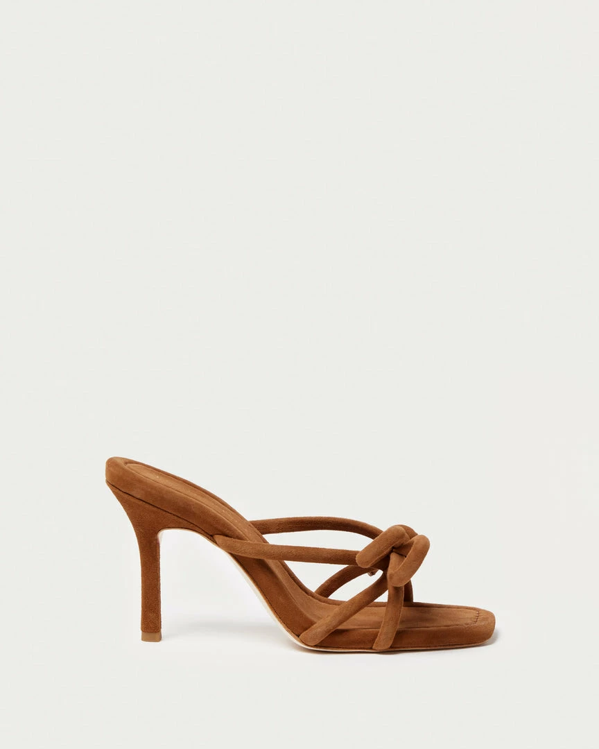Heeled sandal with knotted bow detail in cacao brown suede. Features a padded footbed with gold stamped logo and an open, squared toe. 3.5 inch heel.
