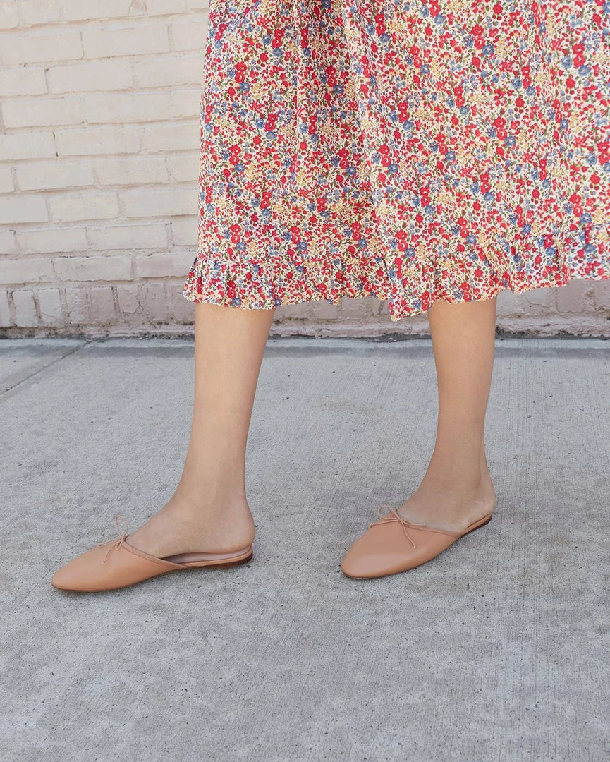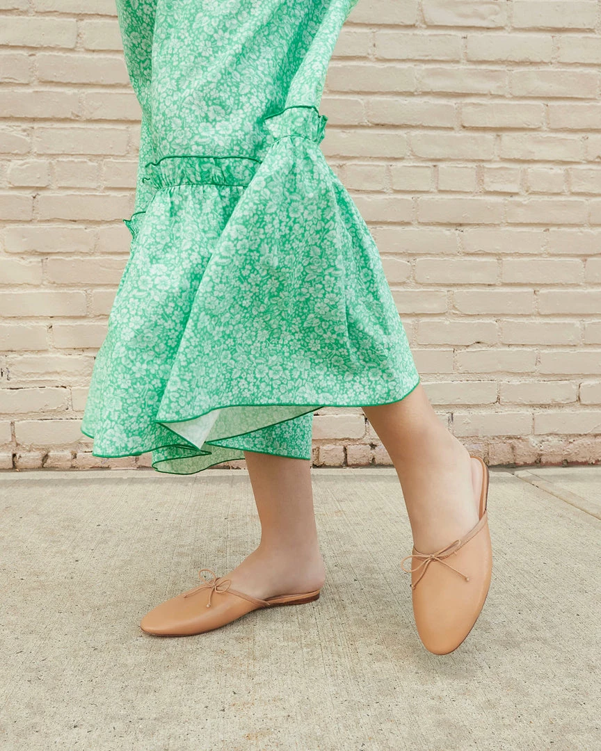 Slip-on flat mule in caramel tan leather with bow detail in center.