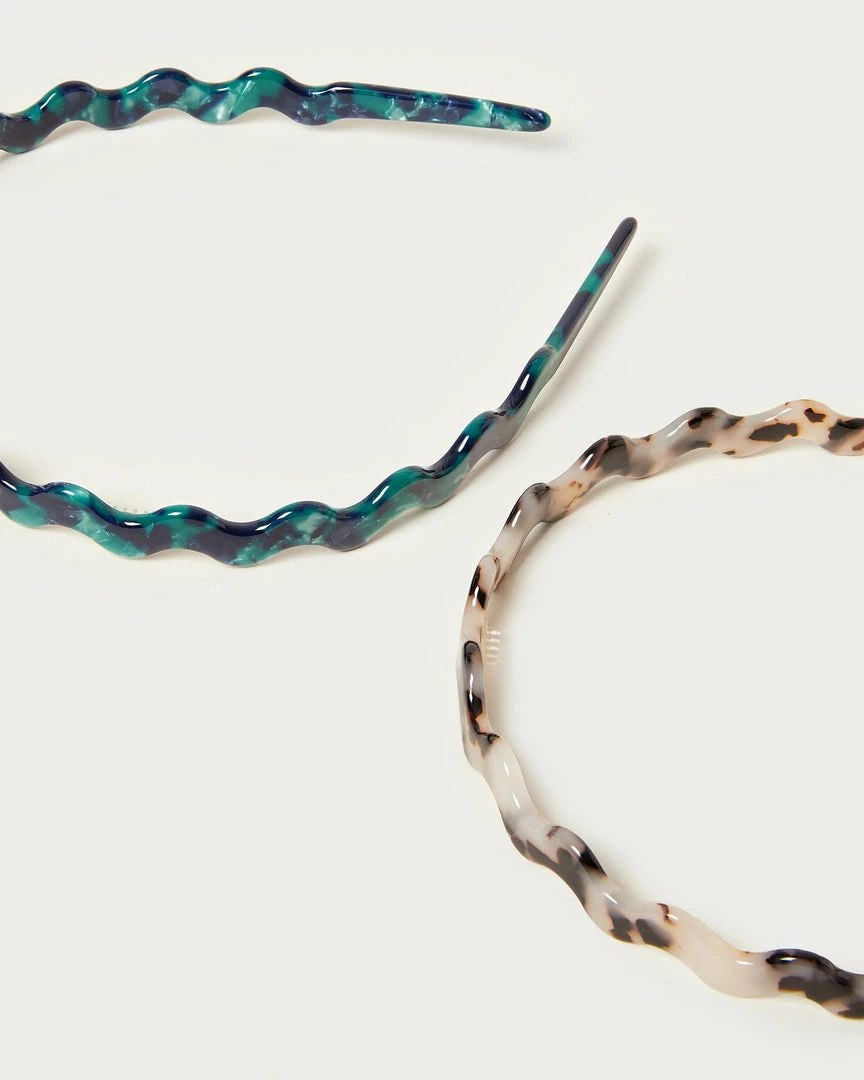 Set of two wavy resin headbands in light brown tortoiseshell and forest green.