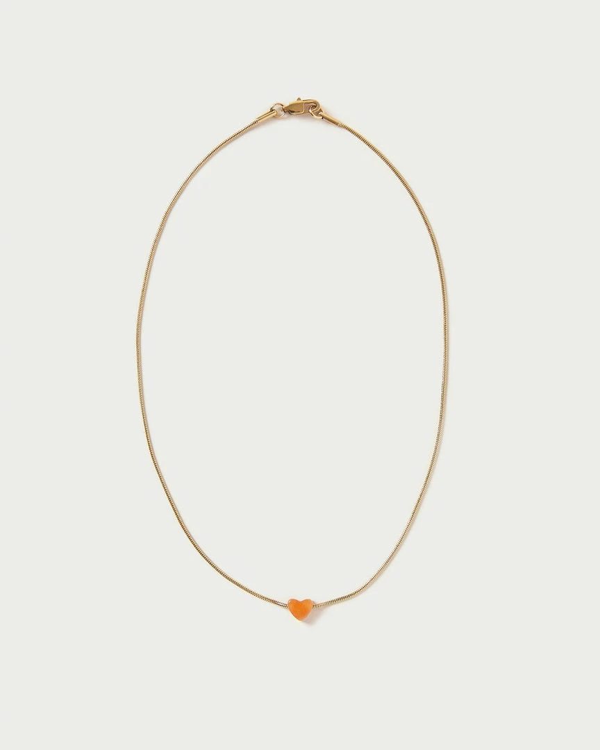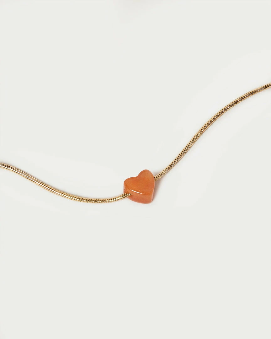Snake chain necklace with heart-shaped red aventurine charm. Gold-plated brass with clasp closure.