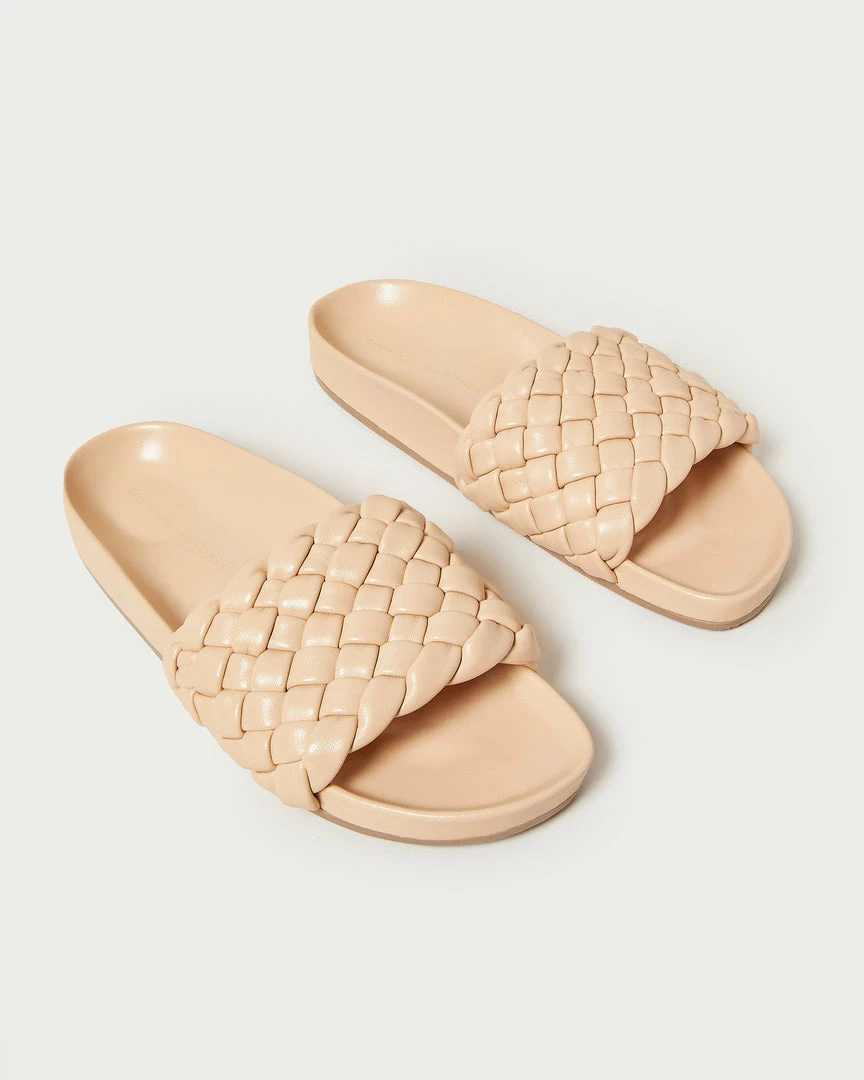 Puffy flat slide sandal in buttery camel brown woven leather. Features a padded leather footbed, gold stamped logo, open toe, and slip-on design.