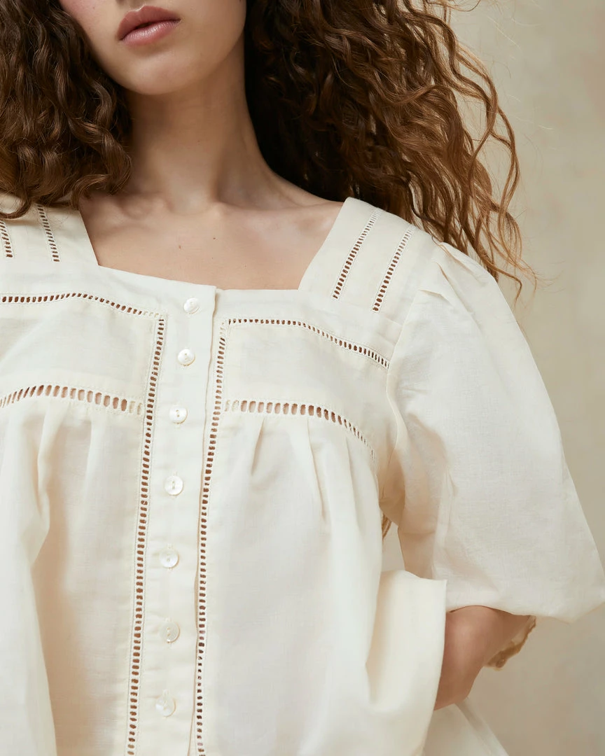 Short-sleeved blouse in desert white cotton ramie. Features a square neckline, ladder stitch embroidery, puffed sleeves, and mother of pearl button-down detailing.