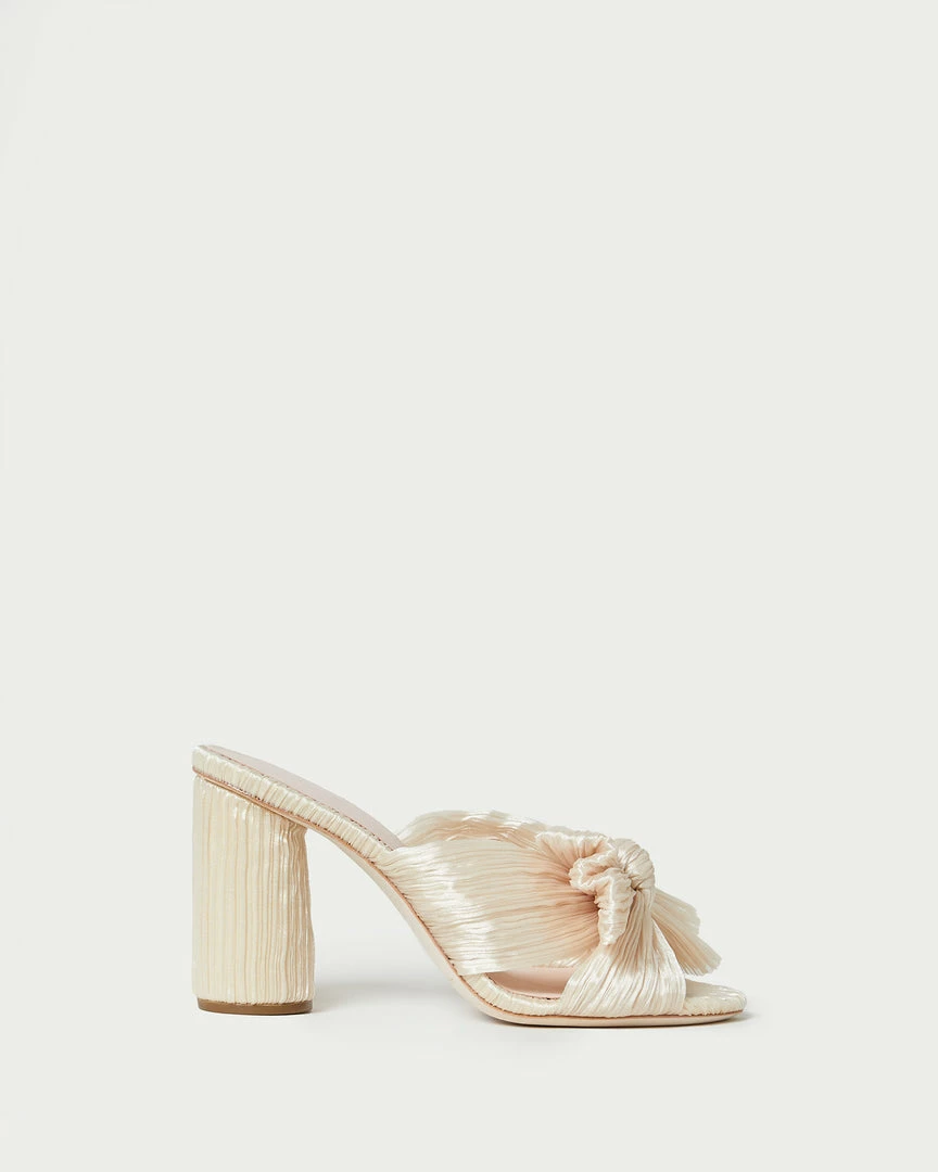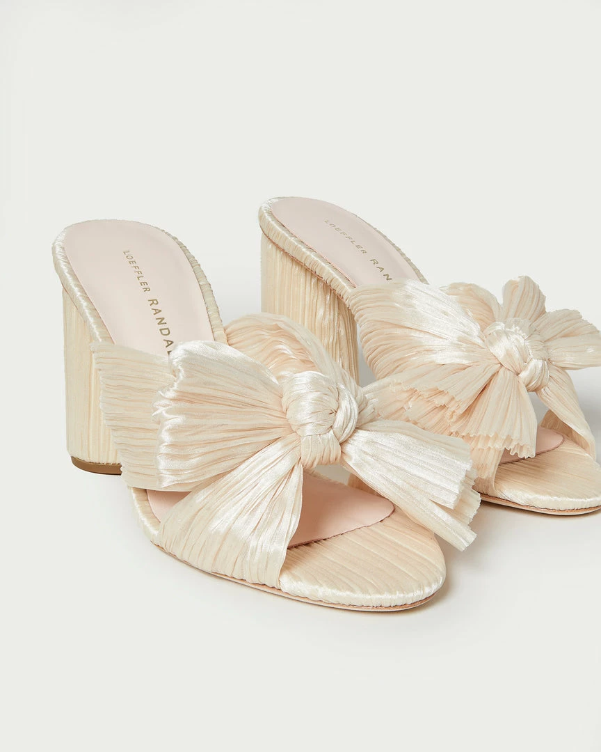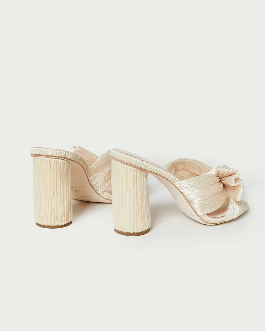 Pleated heeled sandal in cream fabric topped with our signature knotted bow. Features a padded footbed with gold stamped logo and an open toe. 3.5 inch heel.