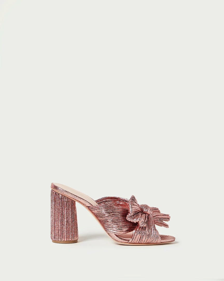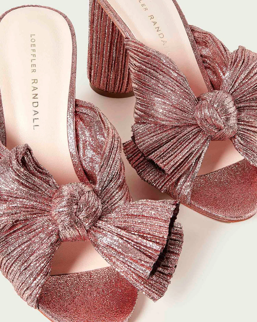 Pleated heeled sandal in metallic rose pink Italian lamé topped with our signature knotted bow. Features a padded footbed with gold stamped logo and an open toe. 3.5 inch heel.
