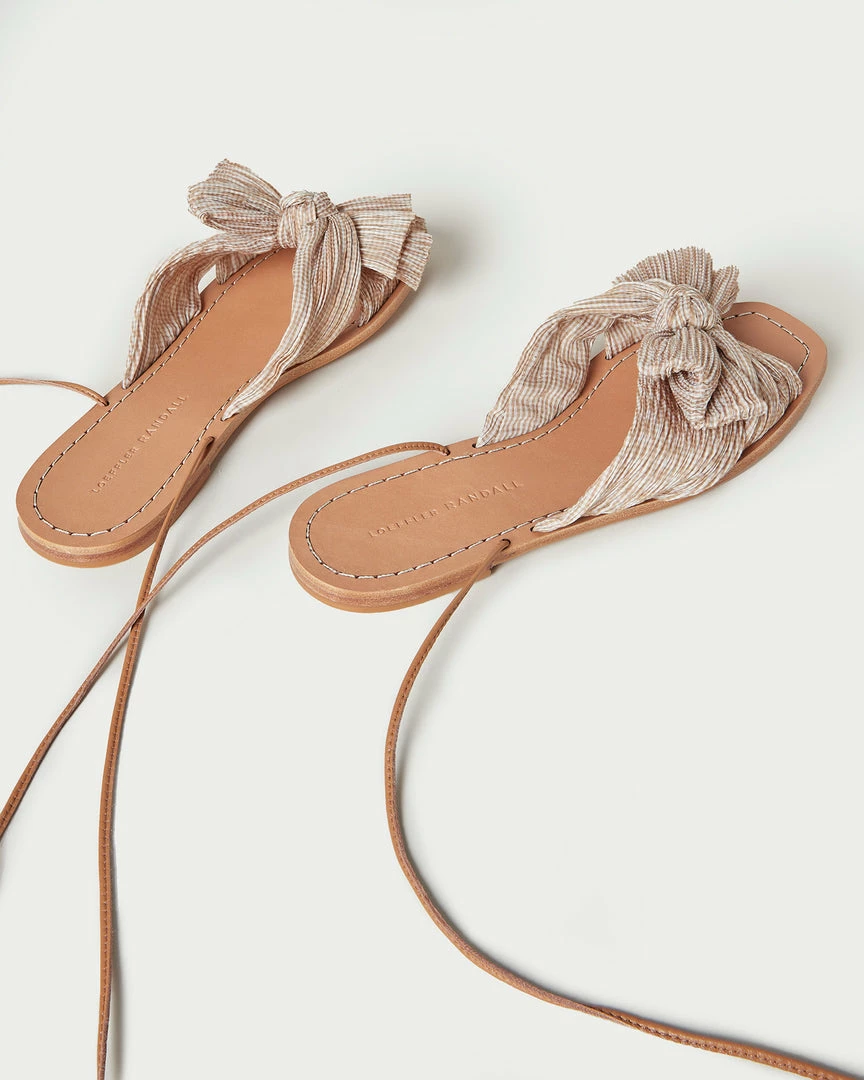 Pleated bow plank sandal in tan and cream gingham-printed fabric. Features a tonal stamped logo, contrast stitching, an open, squared toe, and an ankle wrap closure.