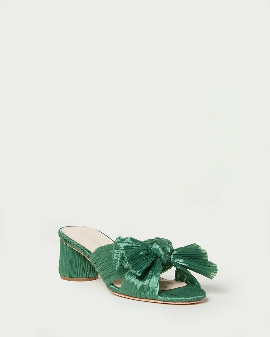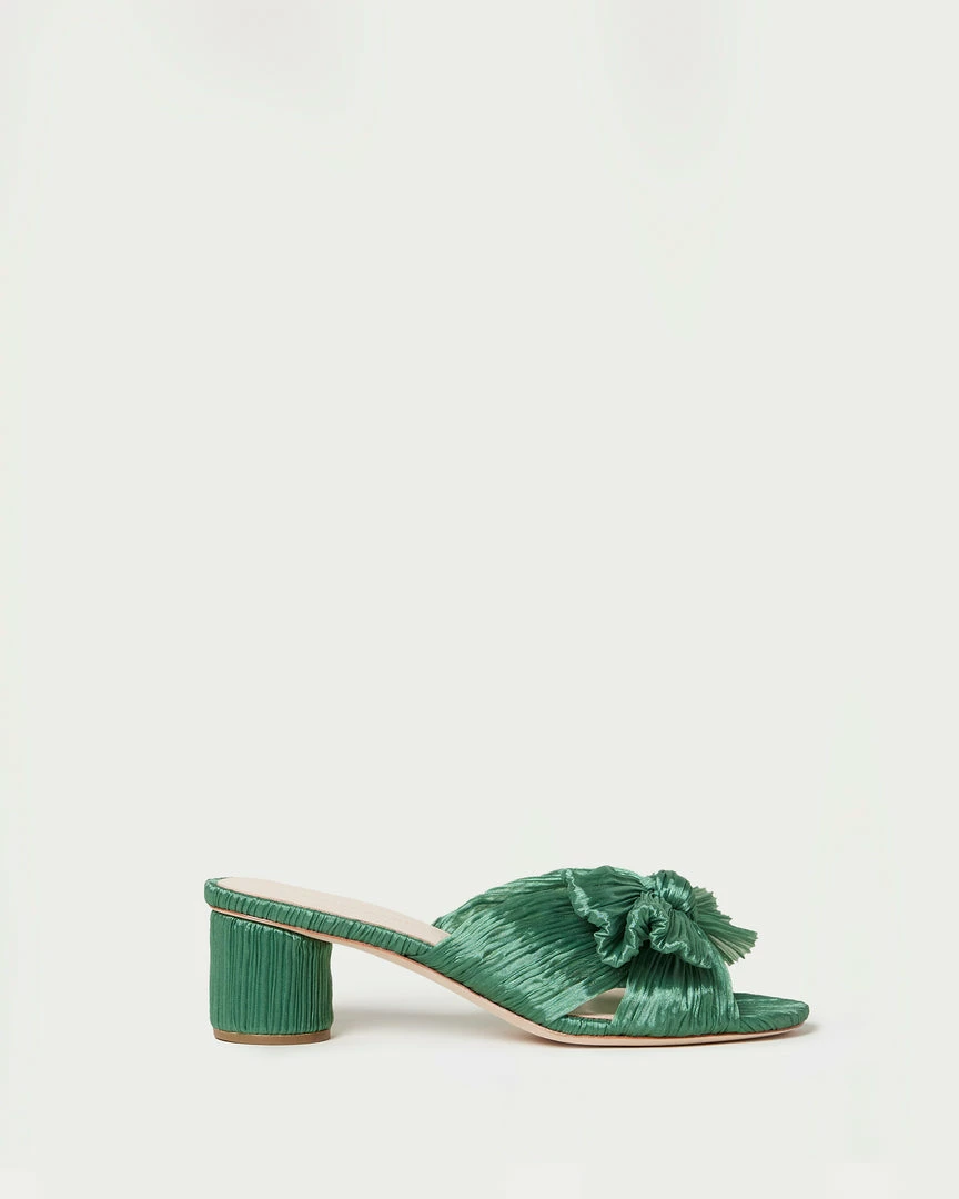 Pleated mid-heeled sandal in sage green fabric topped with our signature knotted bow. Features a padded footbed with gold stamped logo. Open toe, slips on. 2 inch heel.