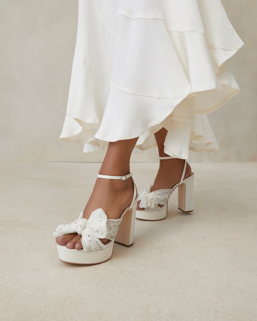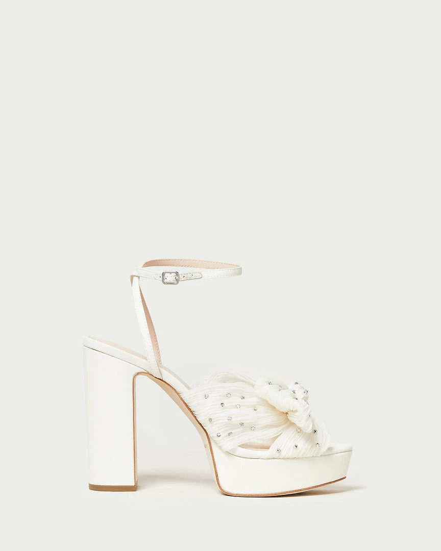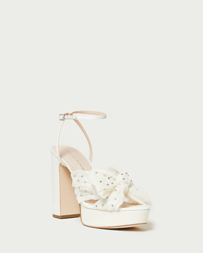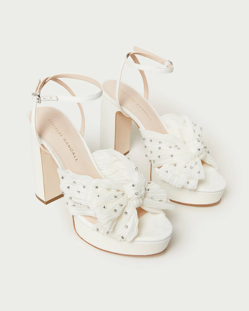 Pleated heeled platform sandal in pearl white fabric with rhinestone embellishment, topped with our signature knotted bow. Features a padded footbed with gold stamped logo, an open toe, and an adjustable buckle ankle strap. 4.5 inch heel, 1 inch platform.