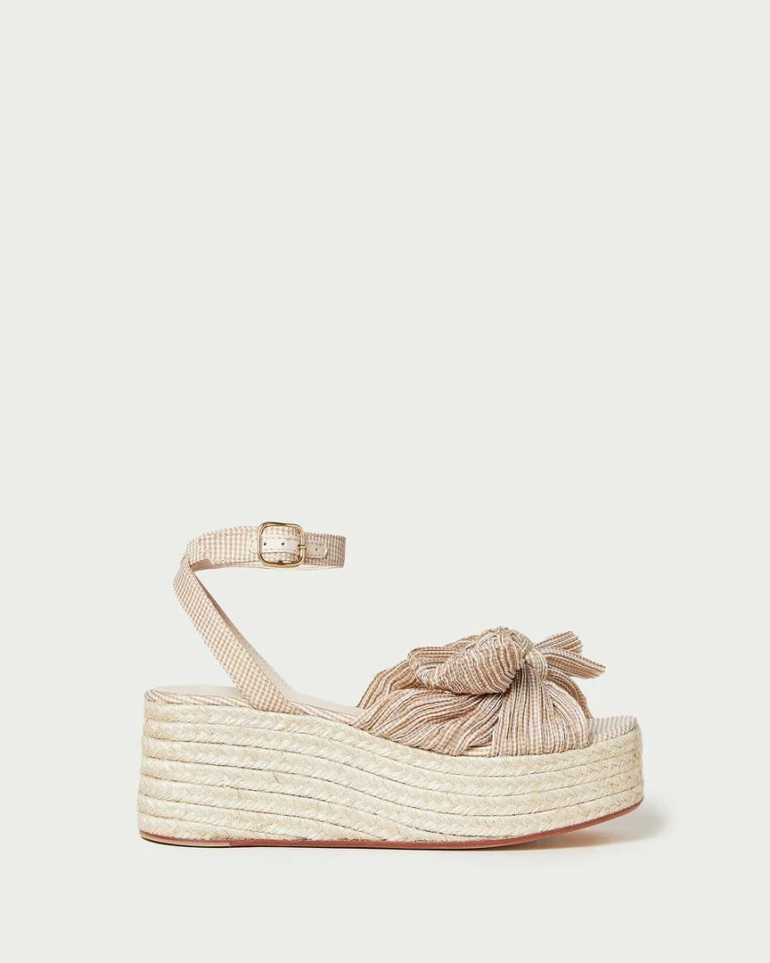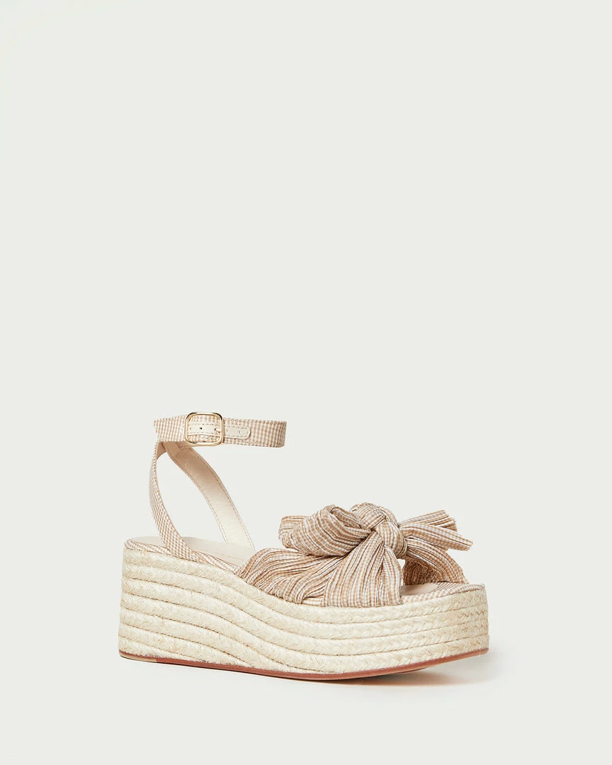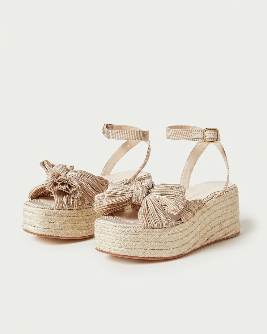 Pleated flatform espadrille sandal in tan and cream gingham-printed fabric topped with our signature knotted bow. Features a padded footbed with gold stamped logo, an open toe, and an adjustable ankle strap. 2.5 inch heel.