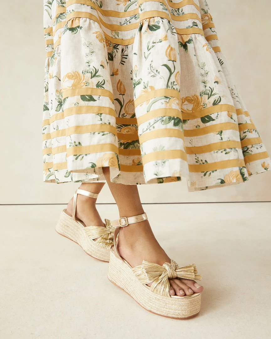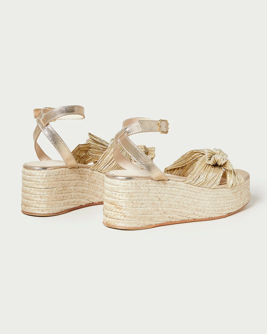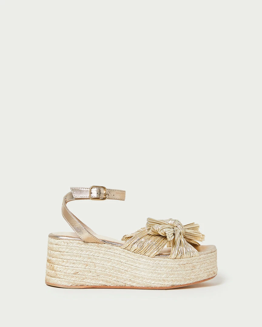 Pleated flatform espadrille sandal in metallic gold lamé topped with our signature knotted bow. Features a padded footbed with gold stamped logo, an open toe, and an adjustable ankle strap. 2.5 inch heel.