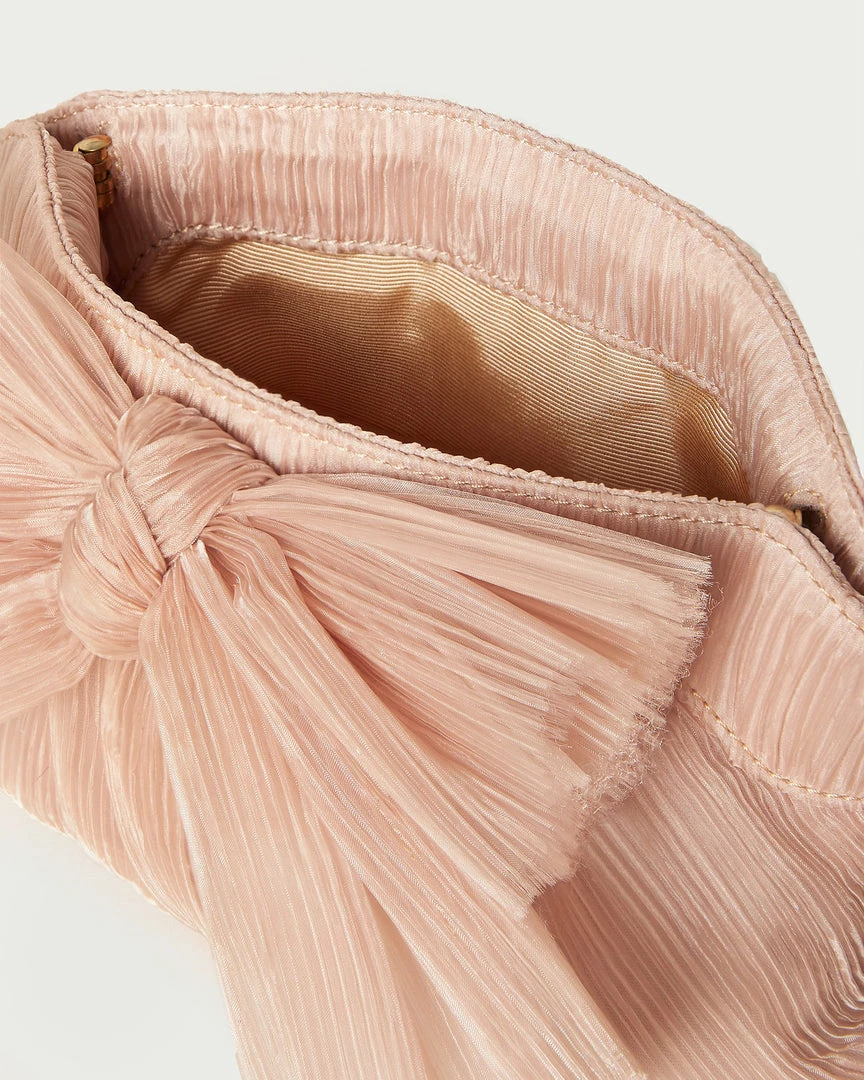 Pleated frame clutch with signature bow detail in a sheer pink fabric. Fully lined with removable twisted gold metal chain strap.