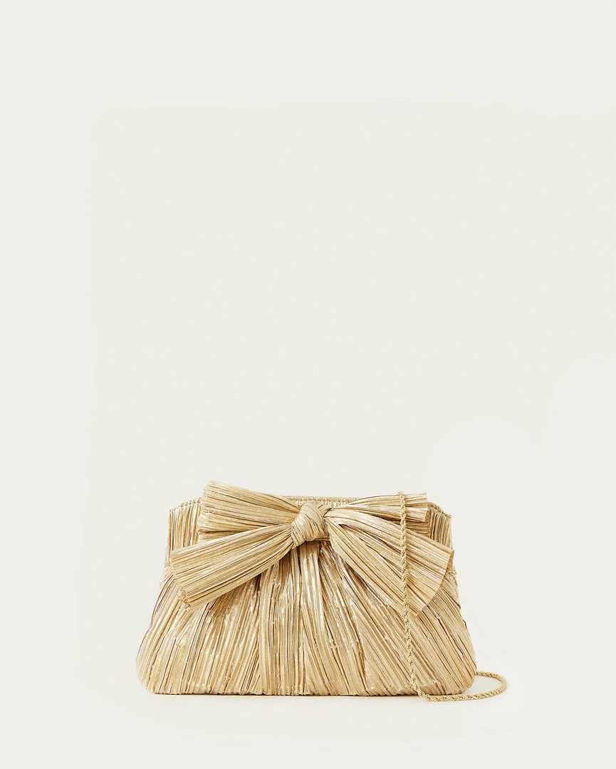 Pleated frame clutch with bow in gold pleated lamé. Fully lined with removable twisted gold metal chain strap.