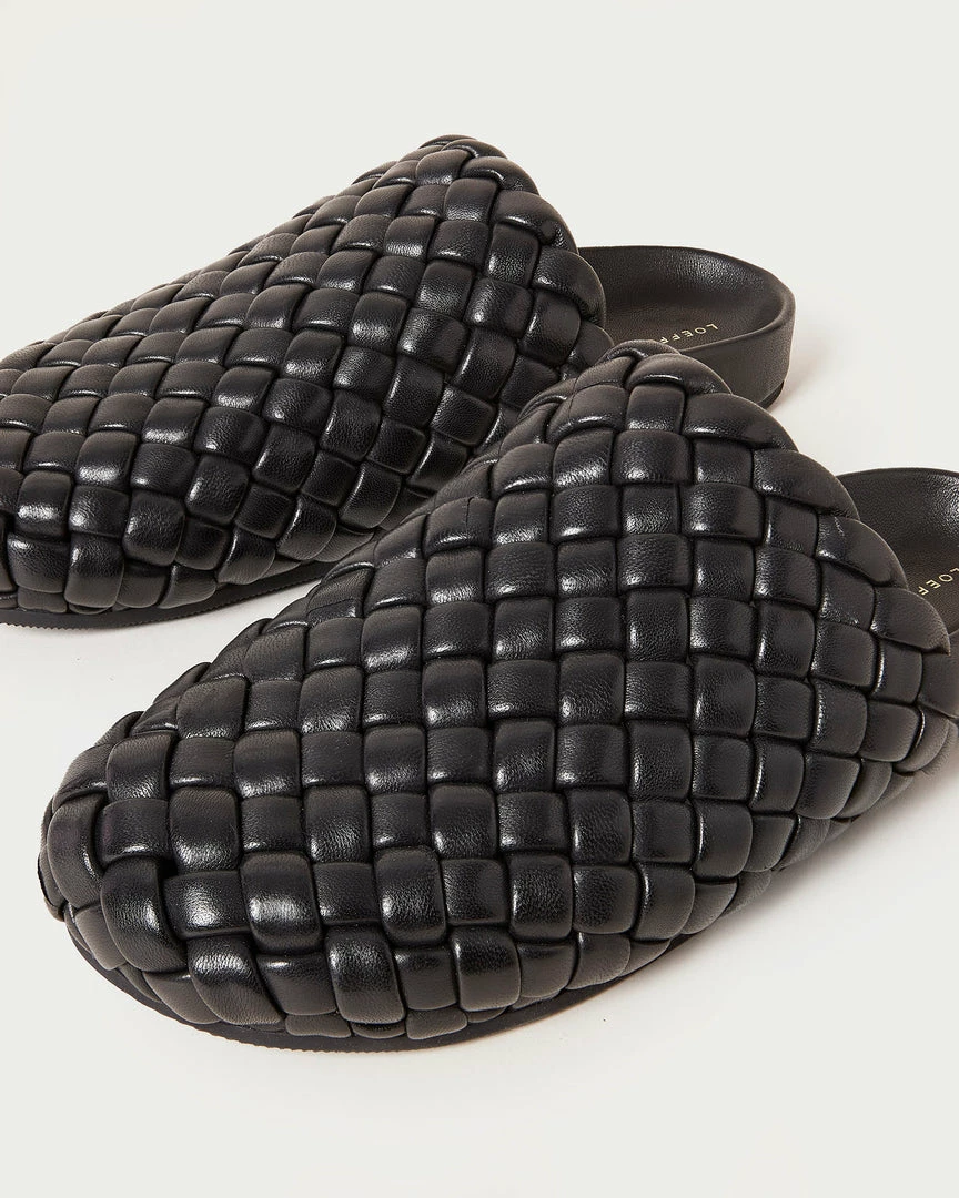 Woven leather backless footbed sandal in black leather. Features a padded footbed with gold stamped logo. Round toe, slips on.