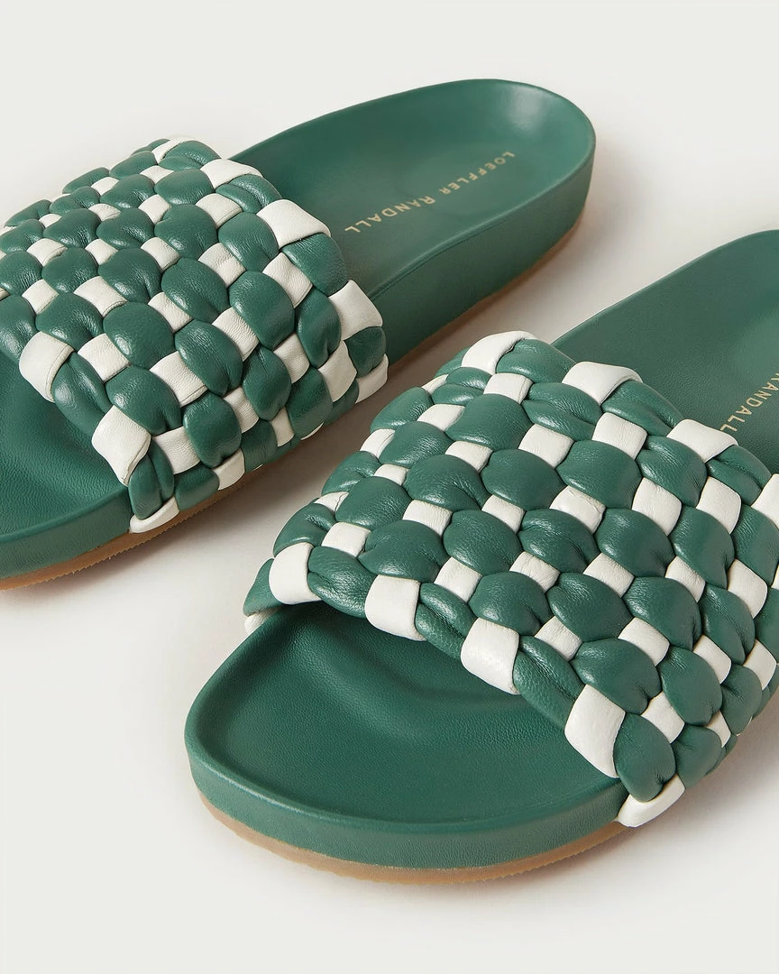 Puffy flat slide sandal with a woven kelly green leather upper and a leather wrapped padded footbed.