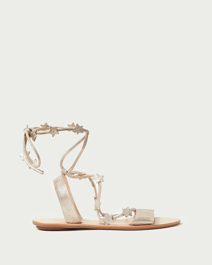 Flat sandal in a champagne silver sparkle kid suede with star embellishments. Gold stamped logo, open toe, ankle wrap and tie.