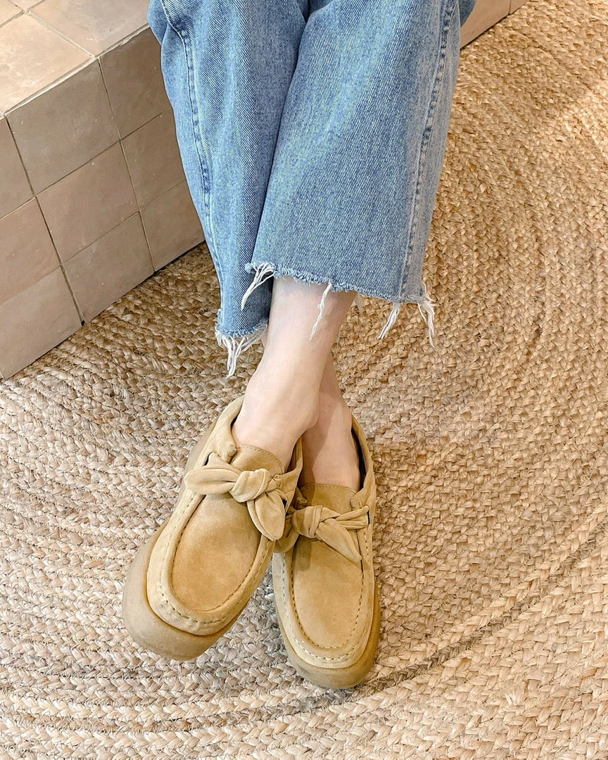 Chukka style slip-on shoe with knot detail in sand tan suede. 0.5″ sole.
