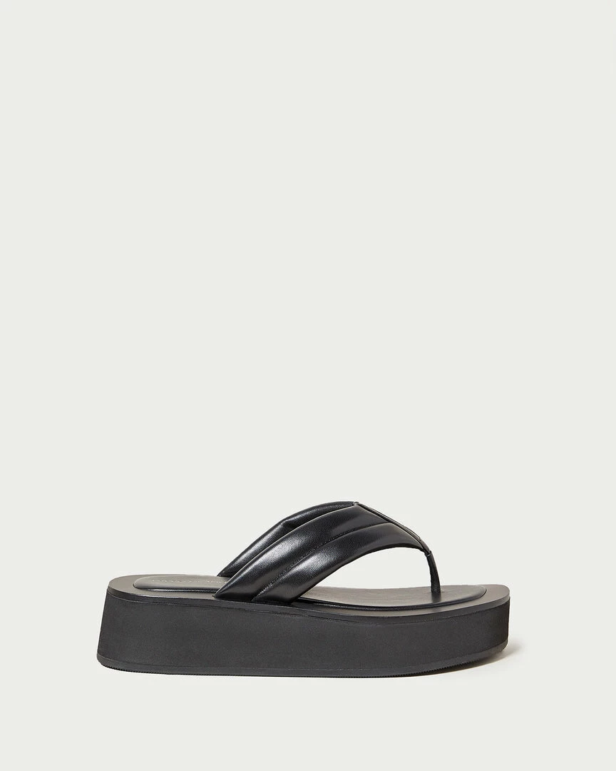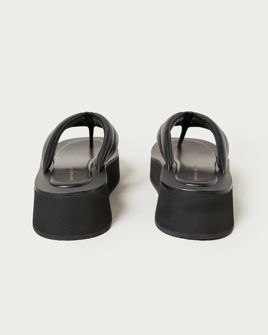 Platform thong sandal in black nappa leather. Features a cushioned, leather-wrapped foam footbed with gold stamped logo, an open toe, and slip-on design. 1.5 inch platform.