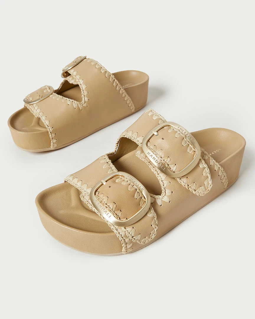 Two band platform footbed sandal in bisque leather with cream raffia embroidery detailing. Features a padded leather footbed, an open toe, and slip-on design. 1.5 inch platform.