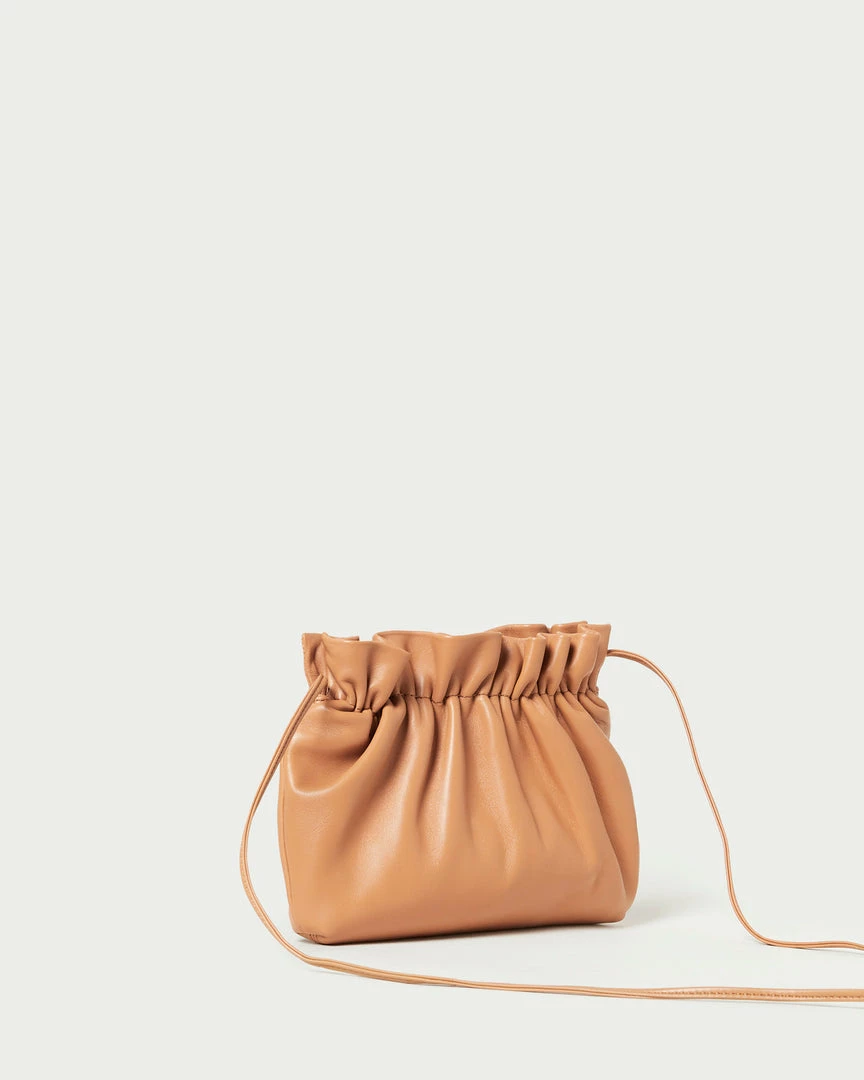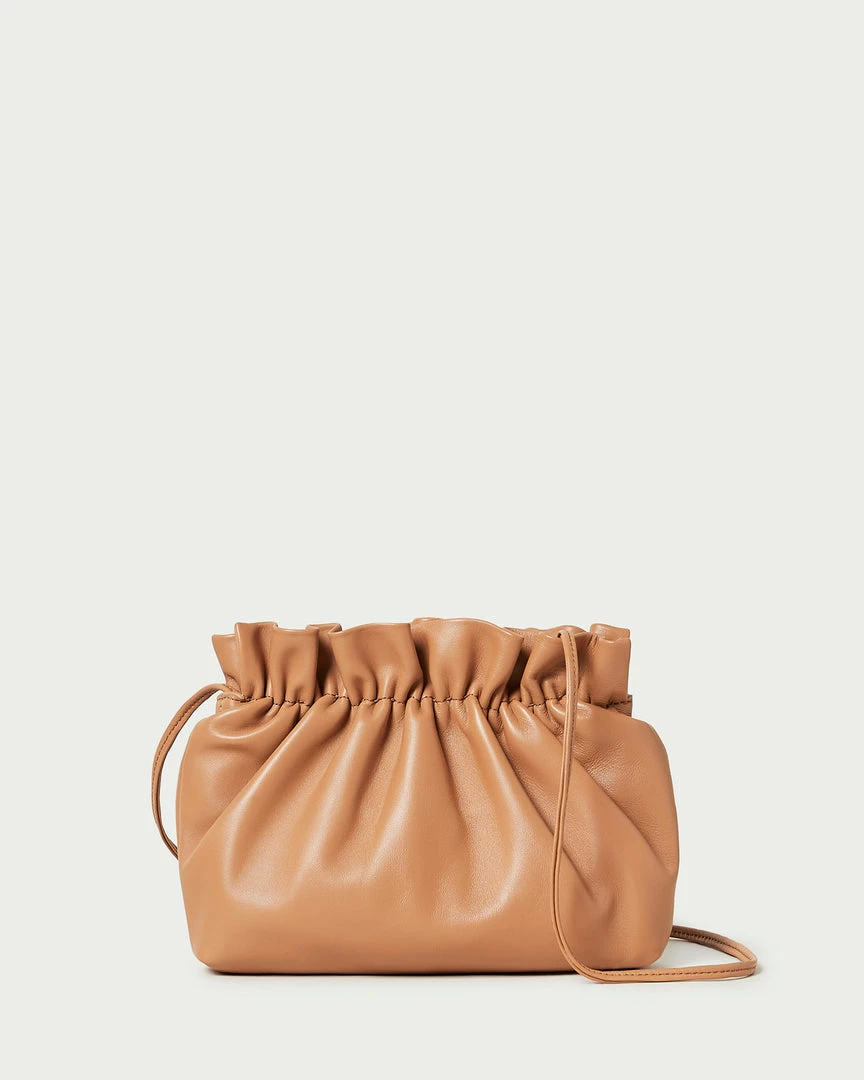 Mini cinched crossbody bag in dark sand tan nappa leather. Features a crossbody strap, frame closure, and cotton lining.
