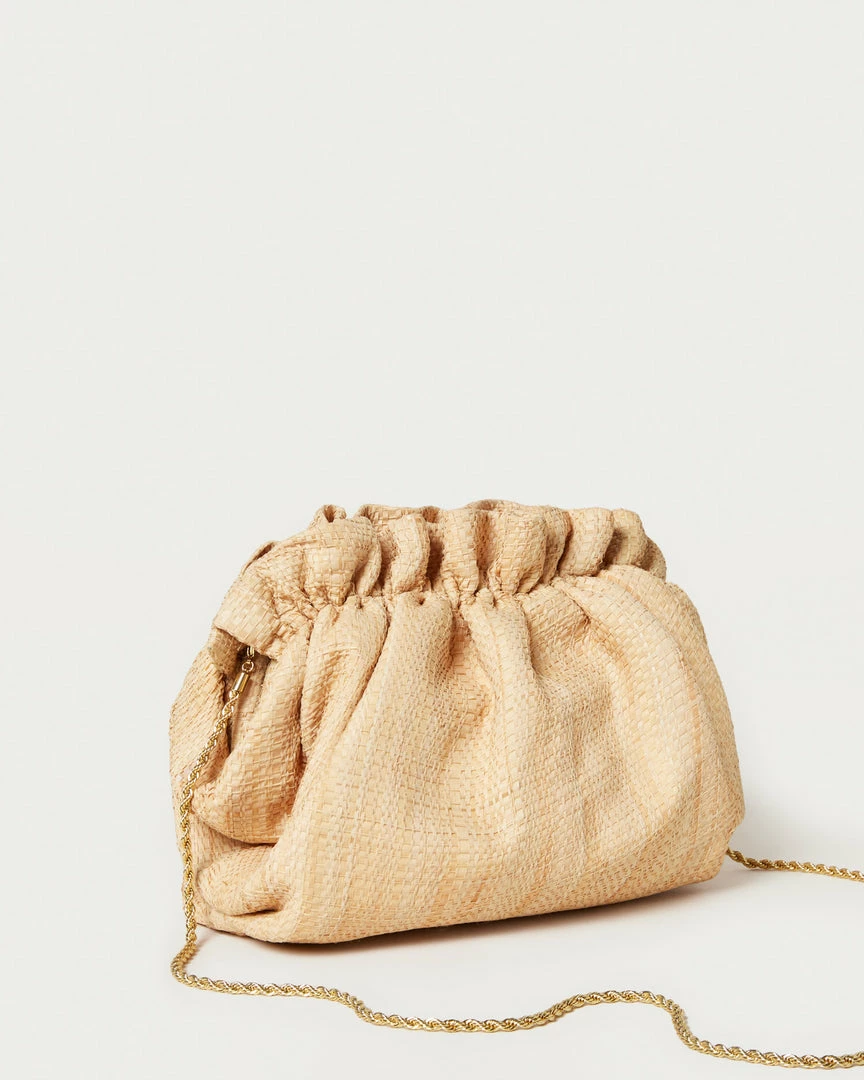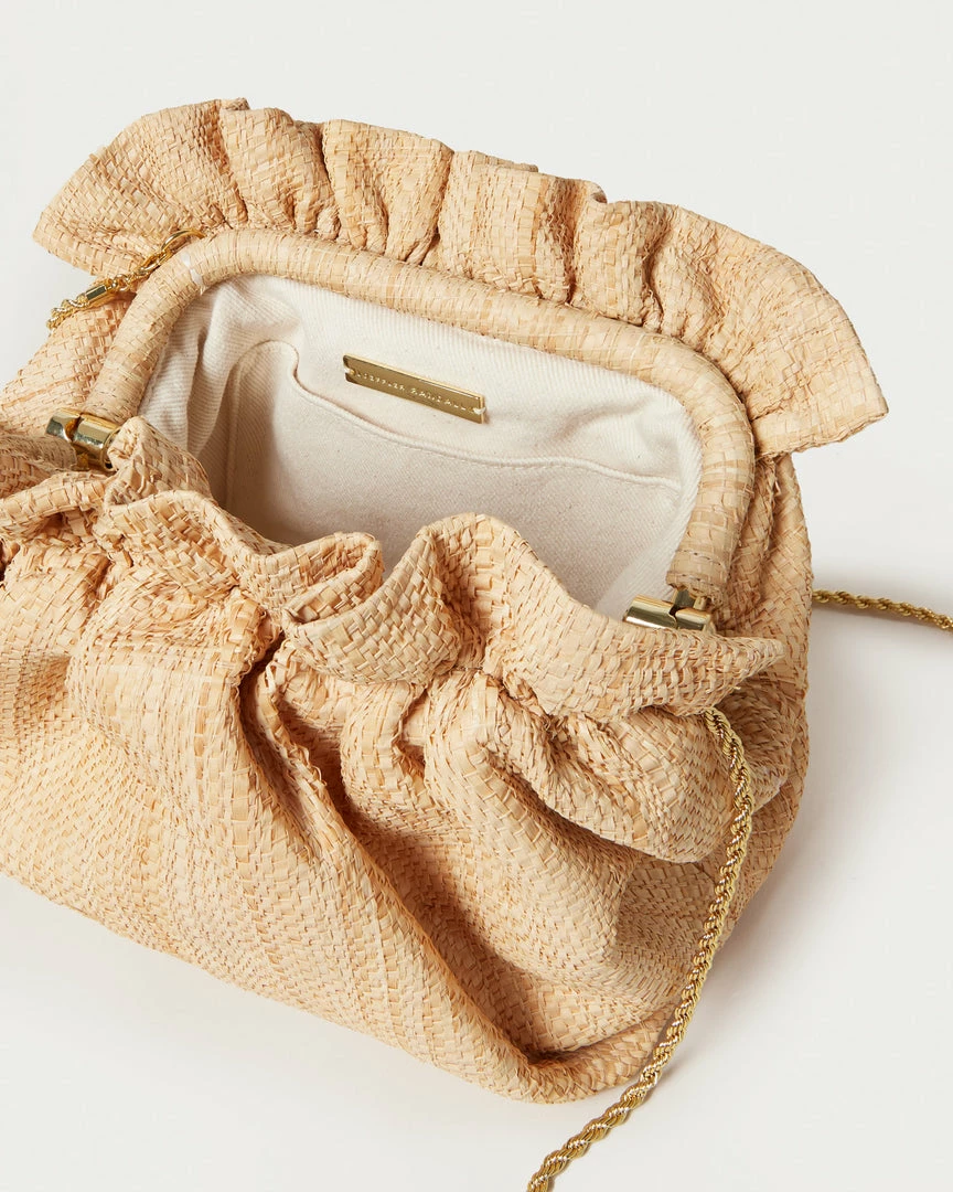 Gathered mini frame clutch in natural raffia. Features a removable twisted gold chain crossbody strap, frame closure, and full lining.