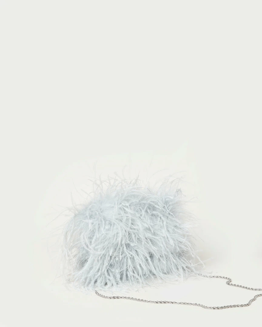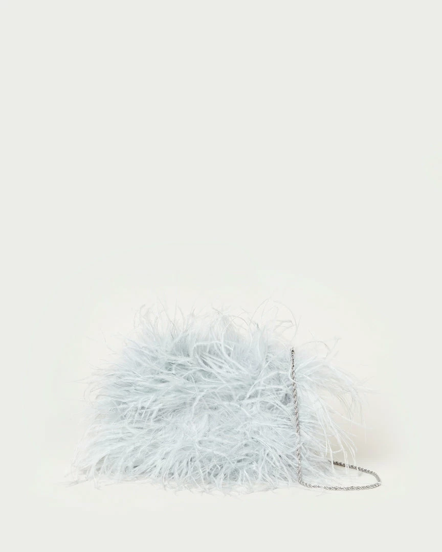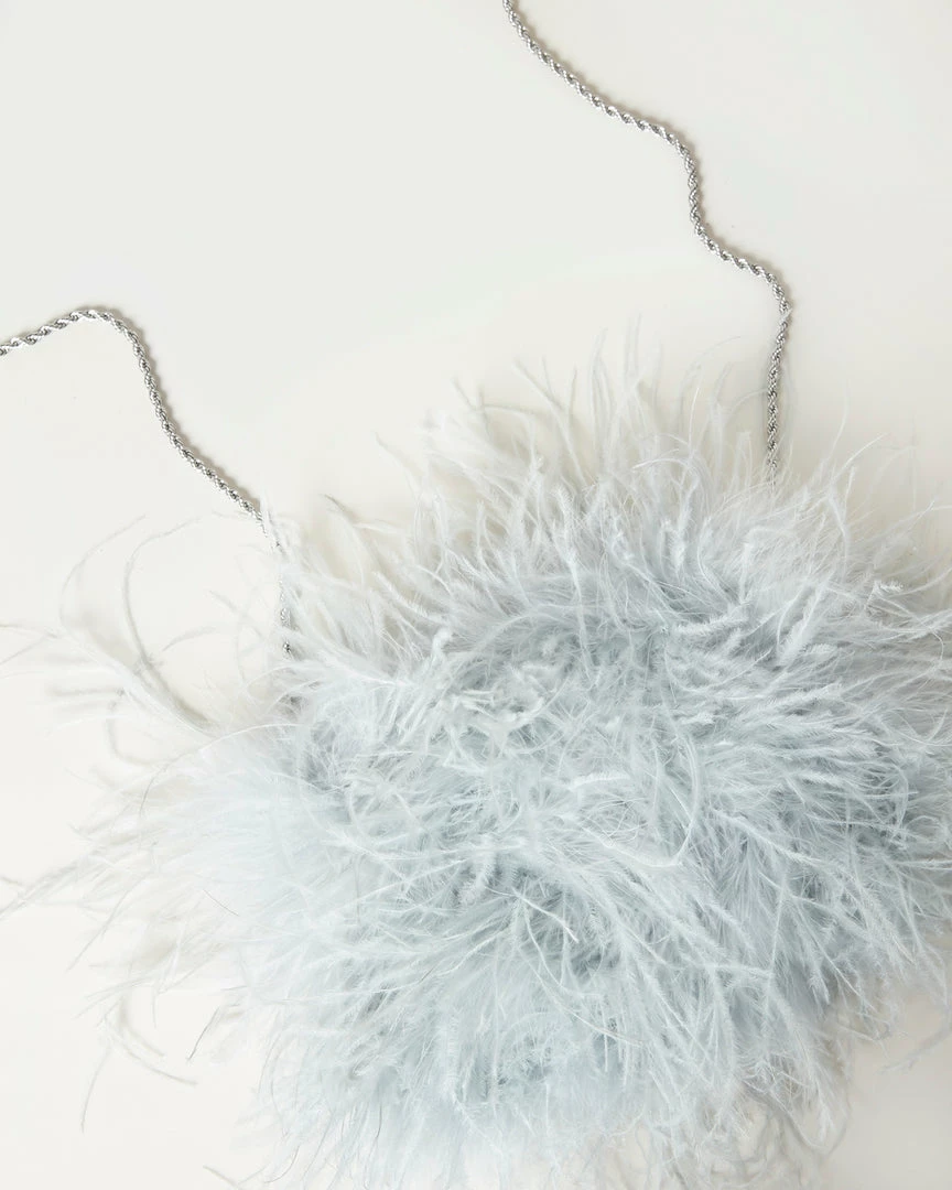 Mini feather pouch in mist light blue feathers. Features a removable twisted gold chain crossbody strap, magnetic closure, full lining, and an interior pocket.
